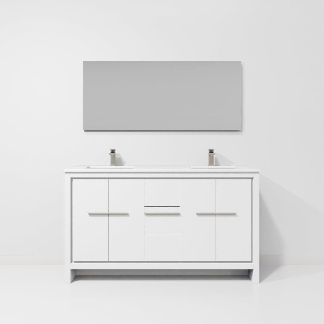 - Dimensions: Vanity nominal size 60 in. W x 20 in. D; overall product dimensions 64 L x 25 W x 50 H (please verify fit with your space and plumbing).
