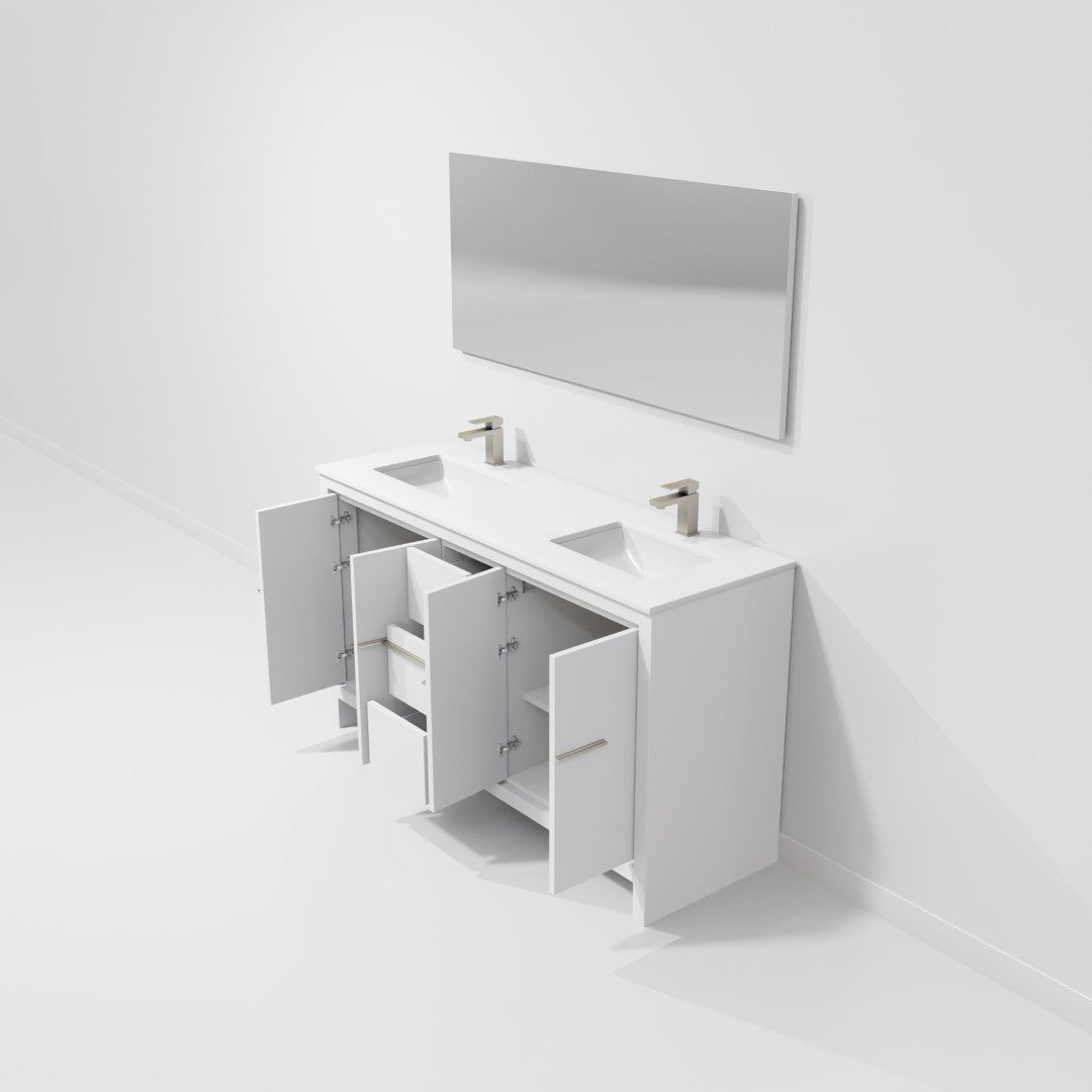 Elevate your bathroom with this elegant white double vanity that combines contemporary styling with durable materials and complete functionality. Ideal for shared bathrooms or master suites, it offers ample storage, a resilient quartz countertop, included fixtures, and a large matching mirror to create a cohesive, high-end look.