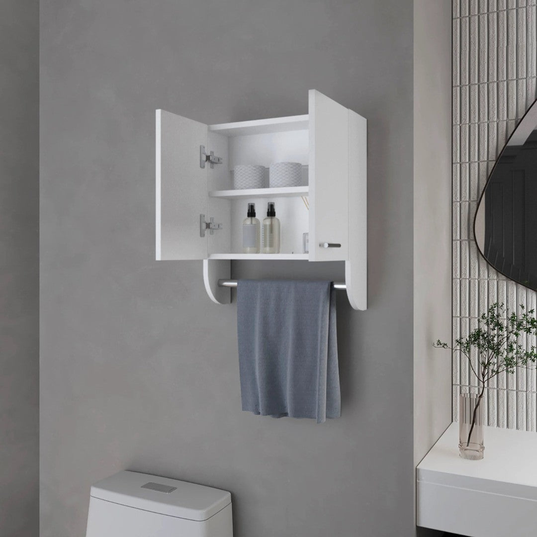 Declutter your bathroom with this sleek white medicine cabinet that combines storage and convenience in a compact footprint. Designed for small bathrooms and tight spaces, it hides toiletries out of sight while offering a built-in towel bar for added functionality. The clean white finish and simple lines create a modern, versatile look that pairs easily with a range of décor styles.