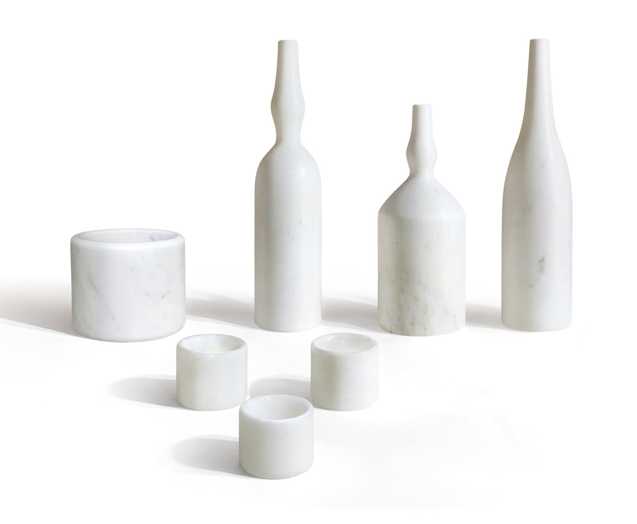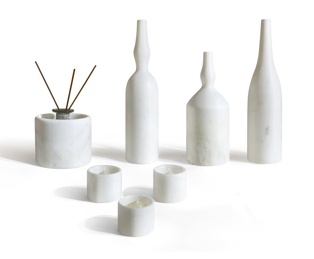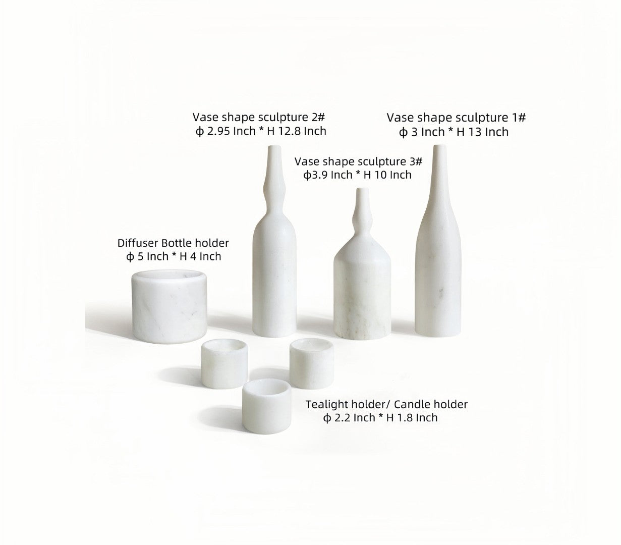 - 1. Snow mountain white natural marble living room accessories set. Luxury natural marble room accessories set. Genuine marble, real marble. 7 pcs set: Diffuser Bottle holder - 1pcs;Tealight holder/ Candle holder - 3 pcs; Design 1# Vase sculpture - 1 pcs; Design 2# Vase sculpture - 1 pcs; Design 3# Vase sculpture - 1 pcs;
