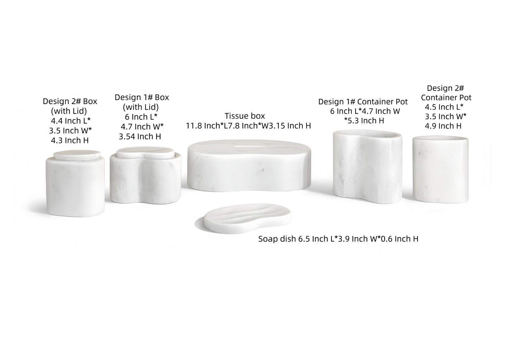 - 1. White natural marble bathroom accessories set two. Genuine marble, real marble. 6 pcs set: Tissue box - 1pcs;Soap dish - 1 pcs; Design 1# Container Pot -1 pcs; Design 2# Container Pot -1 pcs; Design 1# Box (with Lid)- 1 pcs; Design 2# Box (with Lid)- 1 pcs.
