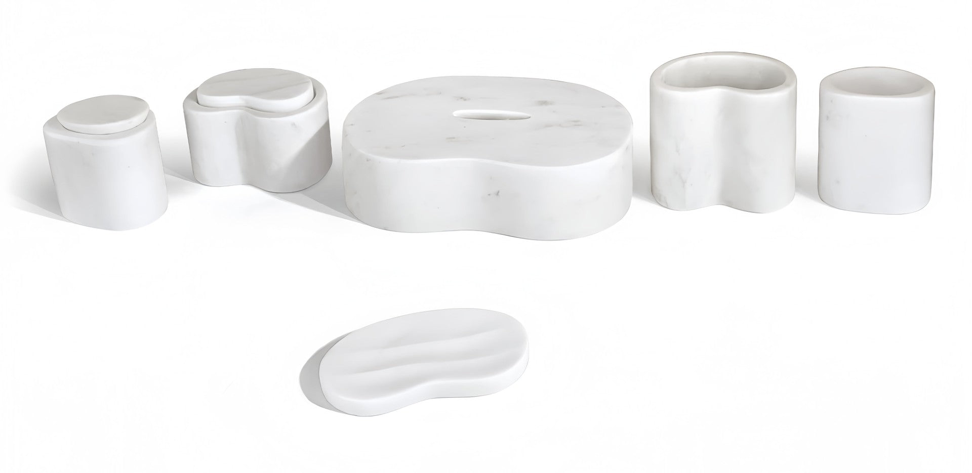 Elevate your bathroom with this elegant six-piece natural white marble accessory set, handcrafted from genuine marble to bring timeless luxury and organic beauty to your space. Each piece showcases unique veining and natural character, creating a cohesive yet individually distinct collection that complements modern and classic interiors alike. Ideal for countertops, vanities, and powder rooms, this set blends durable stone craftsmanship with refined design.