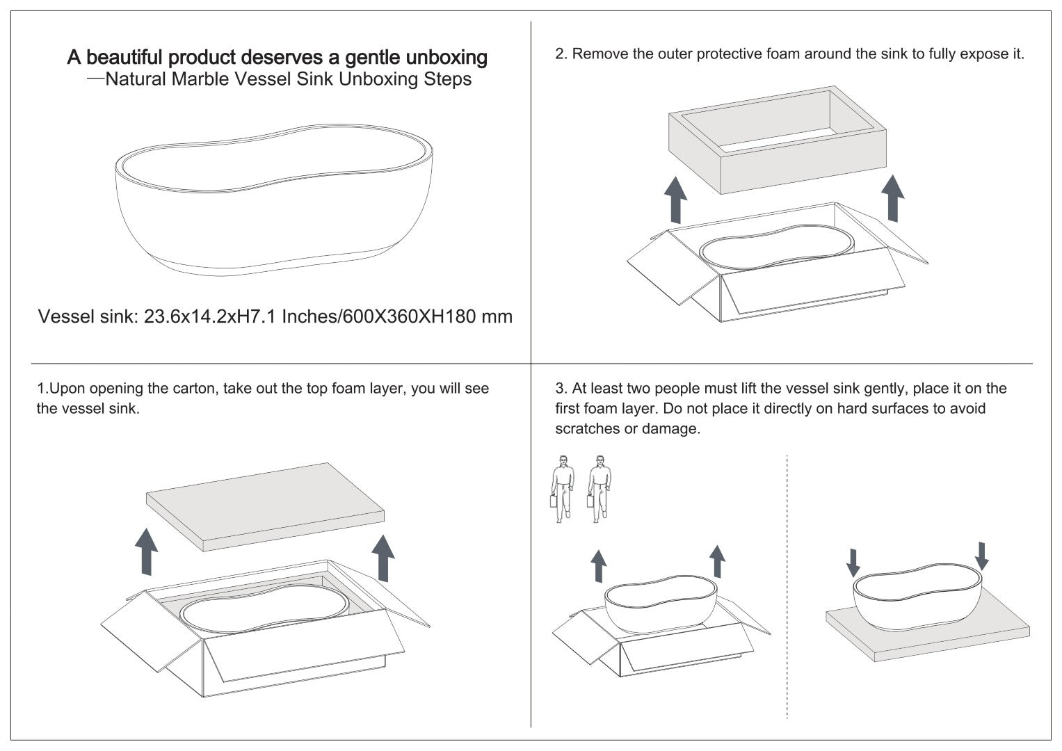 - 1. Dimension: 23.6 x 14.2 x h7.1 inches/600 X 360 X h180 mm. One Box = 1 pieces. Made from one solid piece of natural marble for durability. Not Included: Drain, Faucet, Overflow, Mounting Ring. Installation Type: counter top.