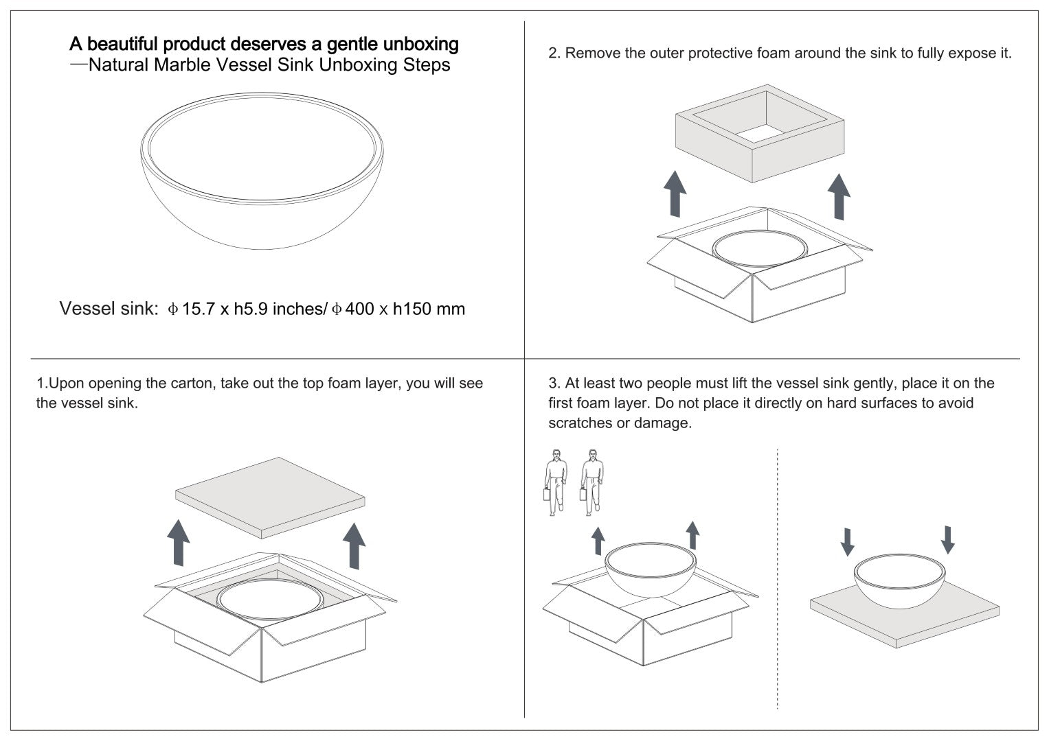 - 1. Dimension: ⌀15.7 x h5.9 inches/⌀400 X h150 mm. One Box = 1 pieces. Made from one solid piece of natural marble for durability. Not Included: Drain, Faucet, Overflow, Mounting Ring. Installation Type: counter top.
