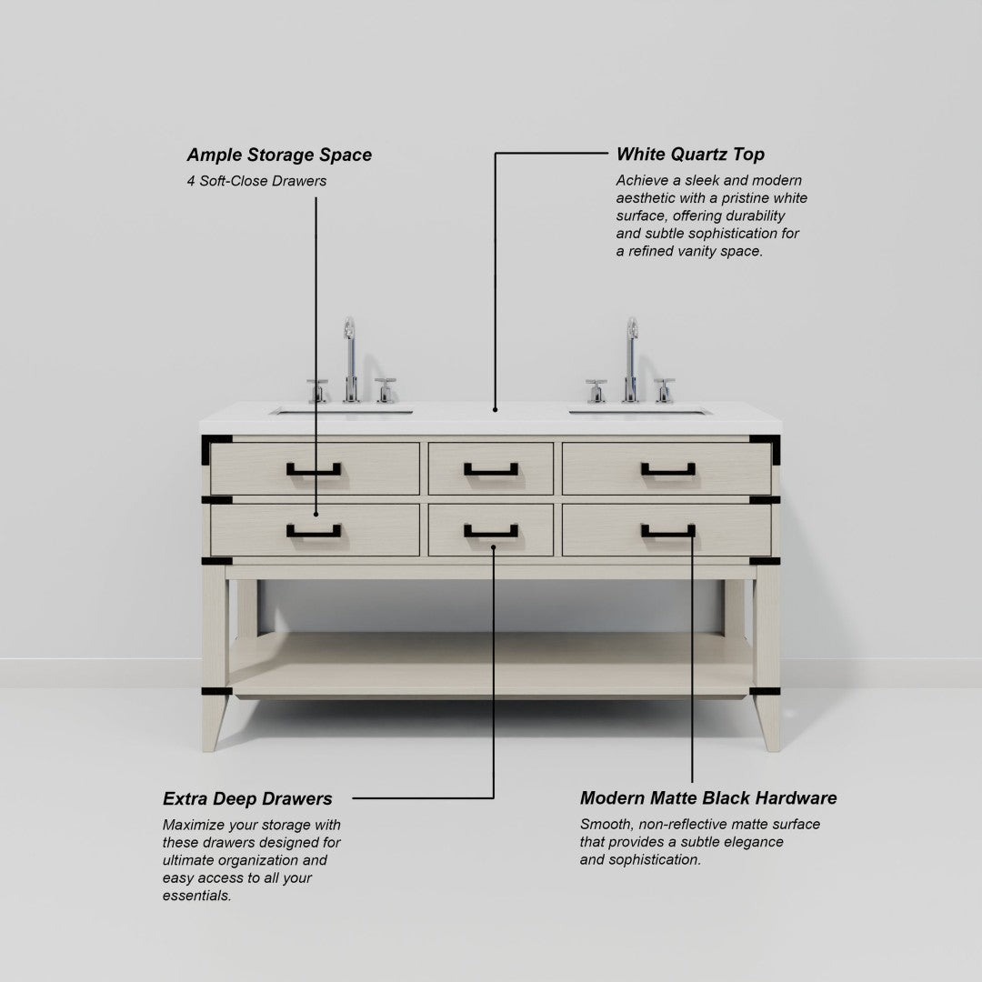 Elevate your bathroom with a refined, durable double vanity that blends natural wood warmth with the sleek elegance of white quartz. Thoughtfully crafted for functionality and style, this vanity offers generous storage, smooth soft-close operation, and a pre-finished quartz top ready for easy installation—an ideal centerpiece for modern or transitional bathrooms.