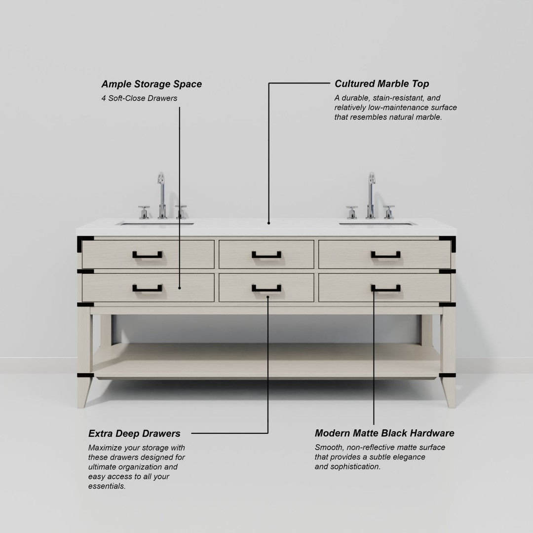- Countertop: Hand-finished cultured marble top, polished and sealed twice for enhanced durability, stain resistance, and long-lasting shine.