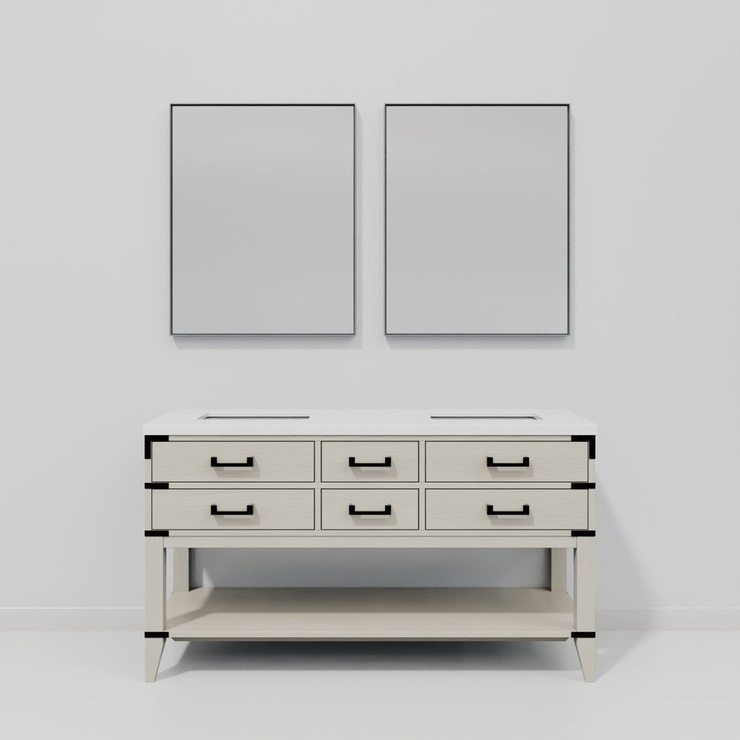 - Dimensions: Vanity width 60 in. x depth 22 in.; Included mirrors: 28 in. W x 36 in. H each; Overall product dimensions: 65 in. L x 25 in. W x 40 in. H.