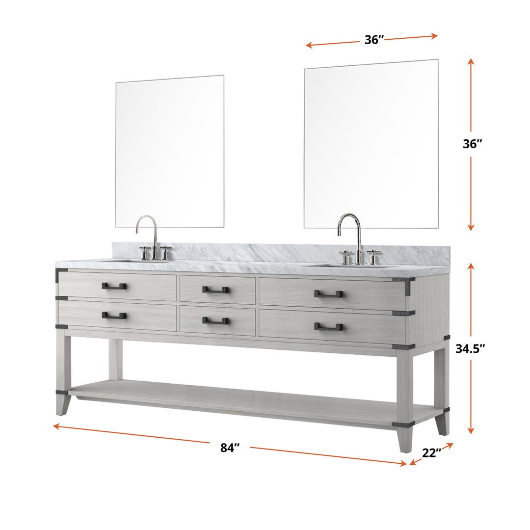 - Mirrors: Two mirrors included—each 36 in. W x 36 in. H—perfectly sized to align above each basin for balanced symmetry.