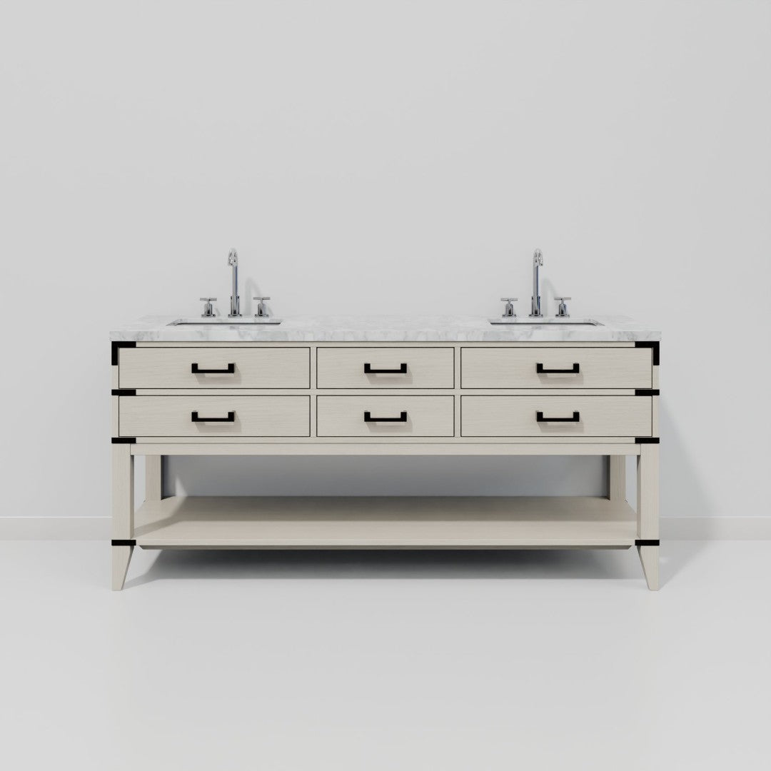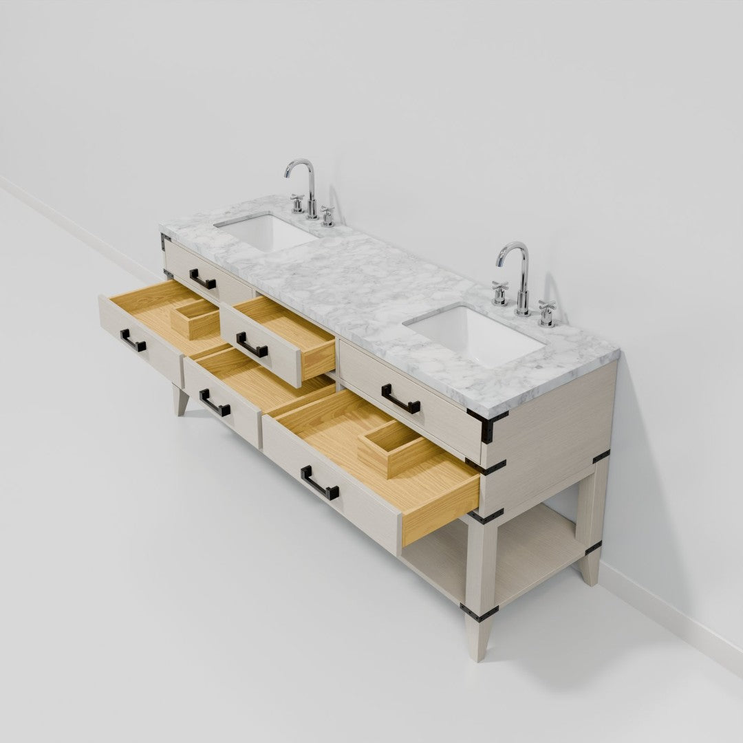 - Storage Capacity: Two-sink double vanity layout with four soft-close drawers plus an open cabinet shelf—ample organized storage for linens, toiletries, and daily essentials.