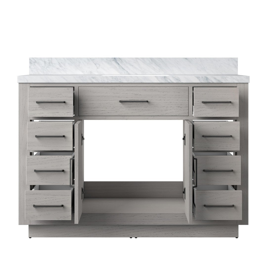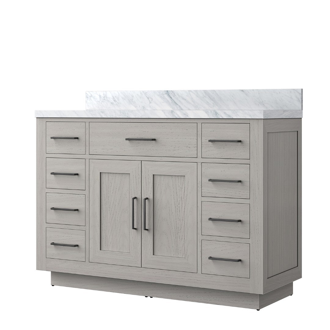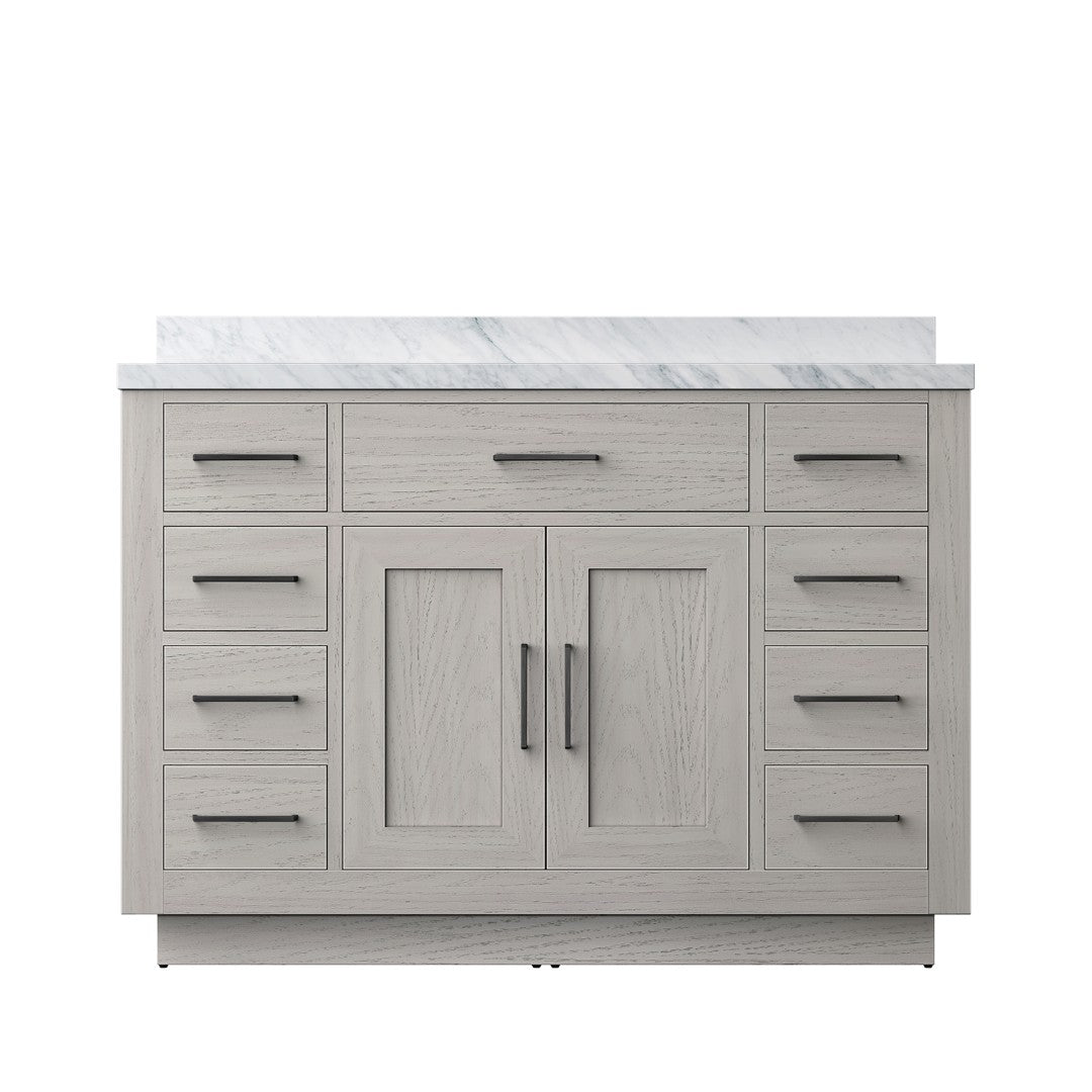 Elevate your bathroom with this refined White Oak single-sink vanity featuring a Carrara marble top. Designed for effortless installation and everyday luxury, the vanity blends solid wood construction with thoughtful storage and soft-close hardware for a quiet, premium experience. Its neutral white oak finish and natural stone countertop suit both modern and classic bathrooms.