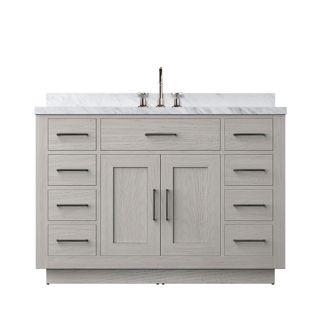 Elevate your bathroom with this elegant White Oak single-sink vanity set, complete with a Carrara marble top and a matching chrome faucet. Designed for everyday functionality and timeless style, the vanity pairs solid wood construction with soft-close hardware and a graceful gooseneck faucet to deliver a polished, durable centerpiece for your space.