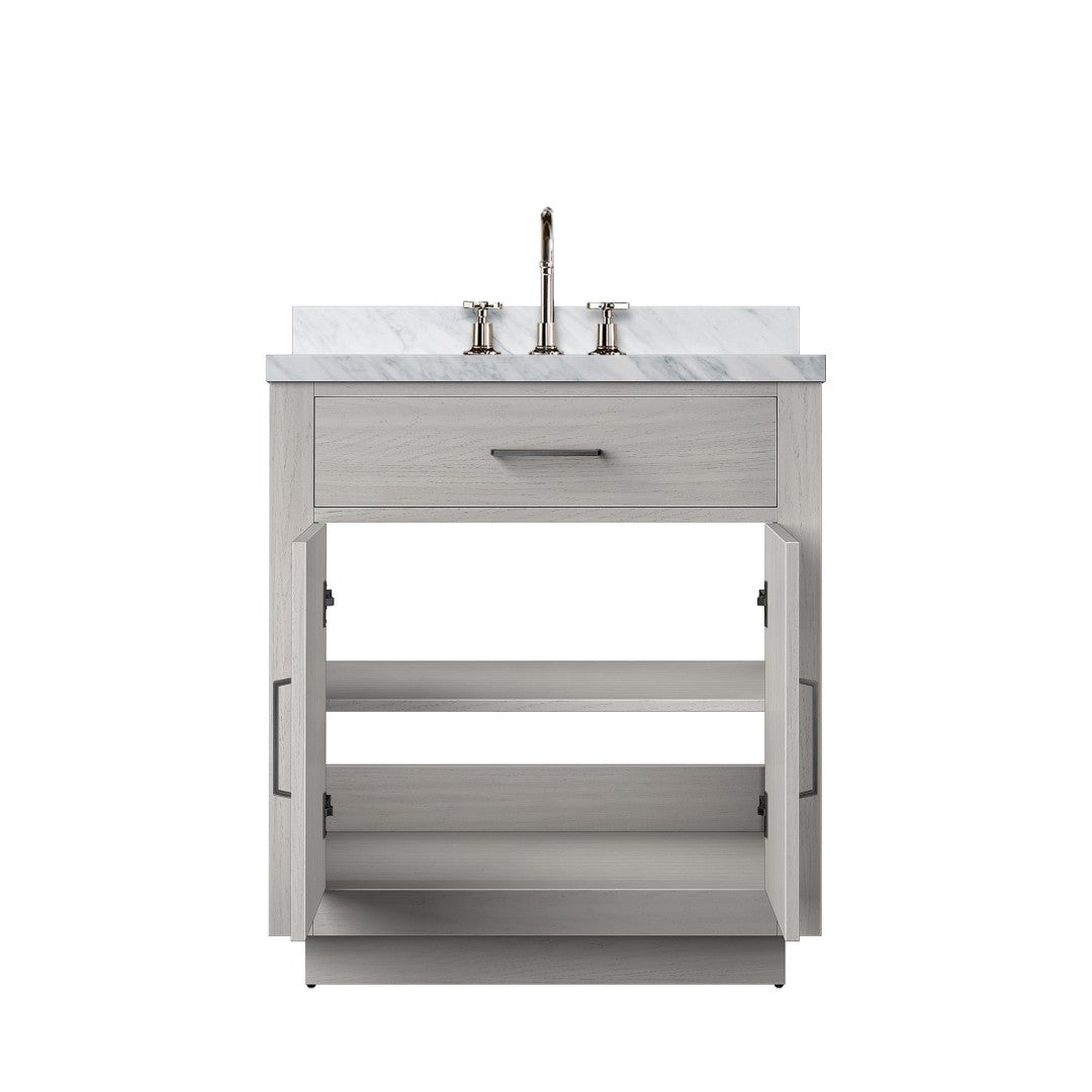 Elevate your bathroom with this refined White Oak single vanity that blends natural warmth with classic marble elegance. Designed for both style and everyday functionality, the unit includes a Carrara marble top and a chrome gooseneck faucet set, offering a complete, ready-to-install solution for a polished, cohesive look.