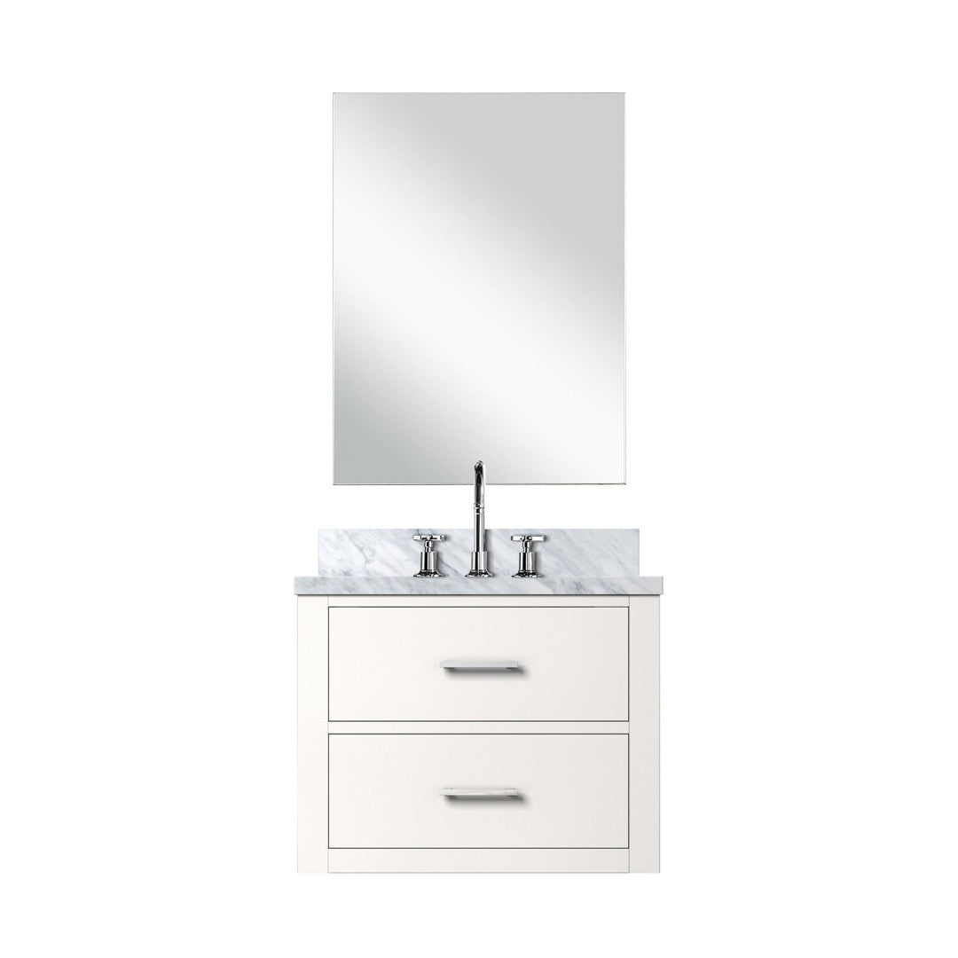 - Included components: Pre-assembled vanity cabinet with acrylic countertop, 18 in. W x 24 in. H frameless mirror, and matching chrome gooseneck faucet.
