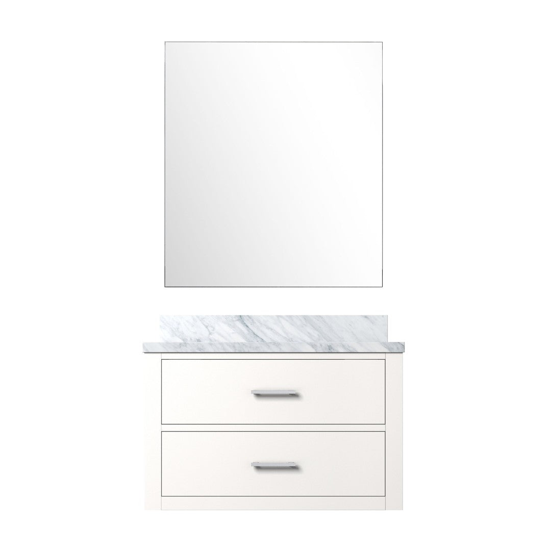 - Included components: Vanity cabinet, Carrara marble countertop with pre-drilled sink opening, and a frameless mirror.