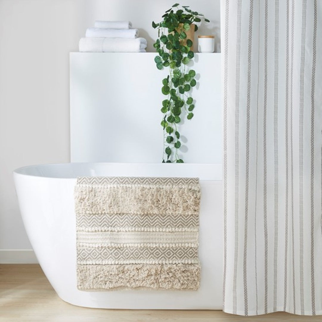 Refresh your bathroom with artisan charm and tactile comfort. This hand-woven bath rug combines layered textures and subtle patterns in a vertical stripe layout for a relaxed Boho feel. Soft, shaggy yarns alternate with taupe geometric weaving and fabric manipulation techniques to create visual depth and a cozy underfoot experience—plus practical features that make it easy to care for and keep in place.