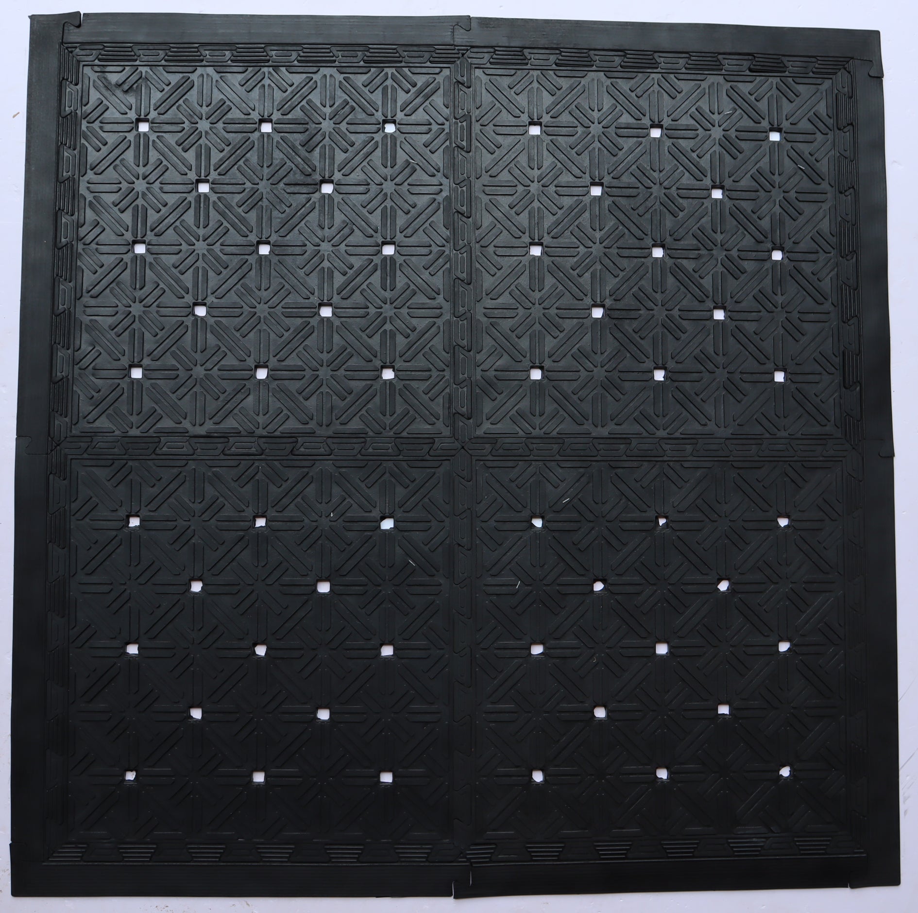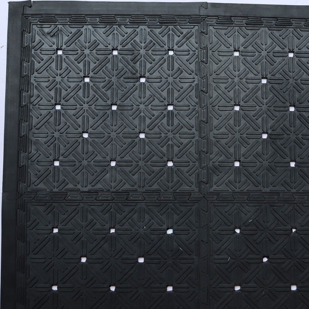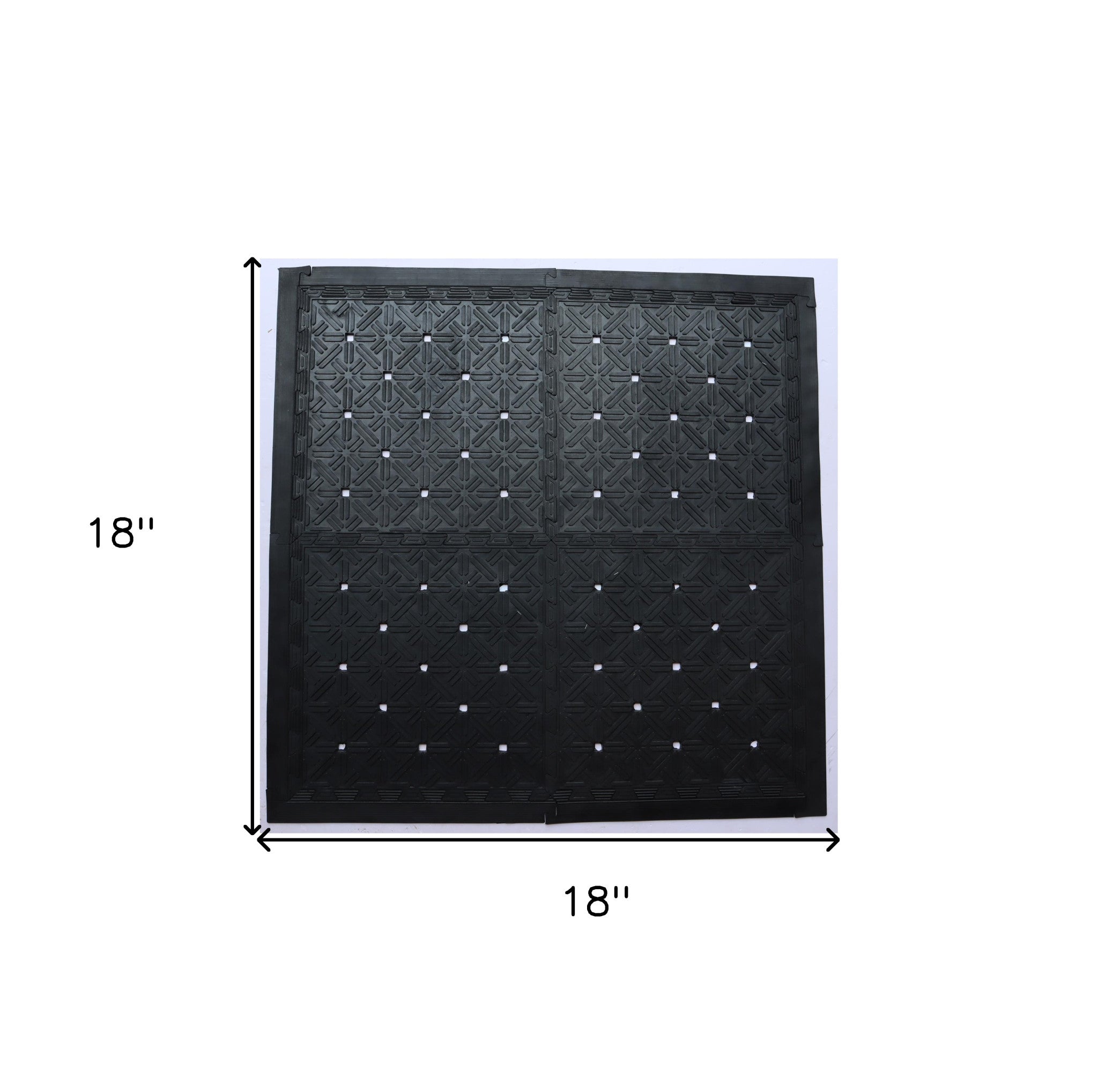 - Modern large 36-inch square mat is created with interlocking 18-inch rubber tiles.
