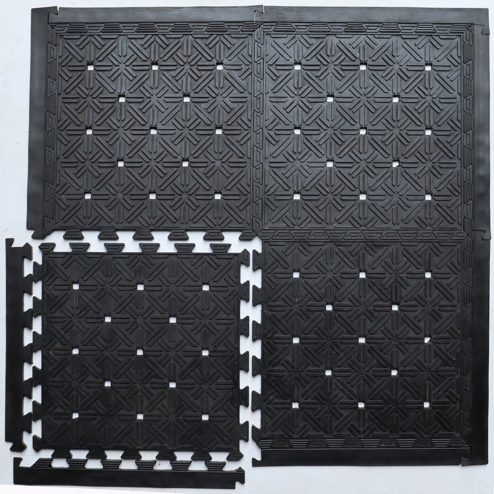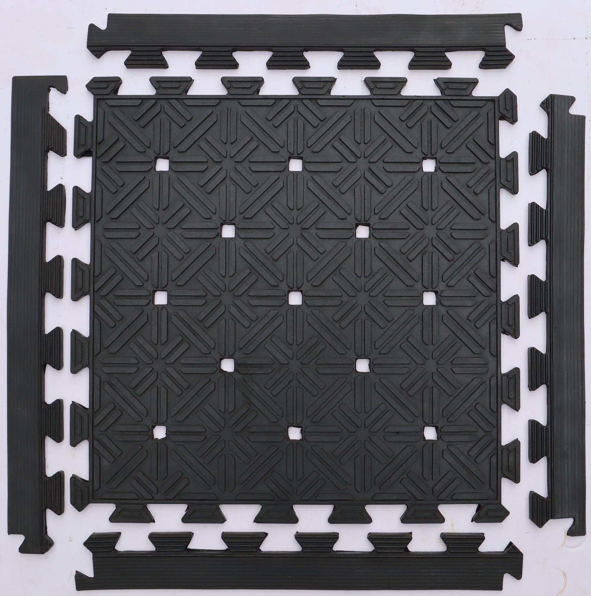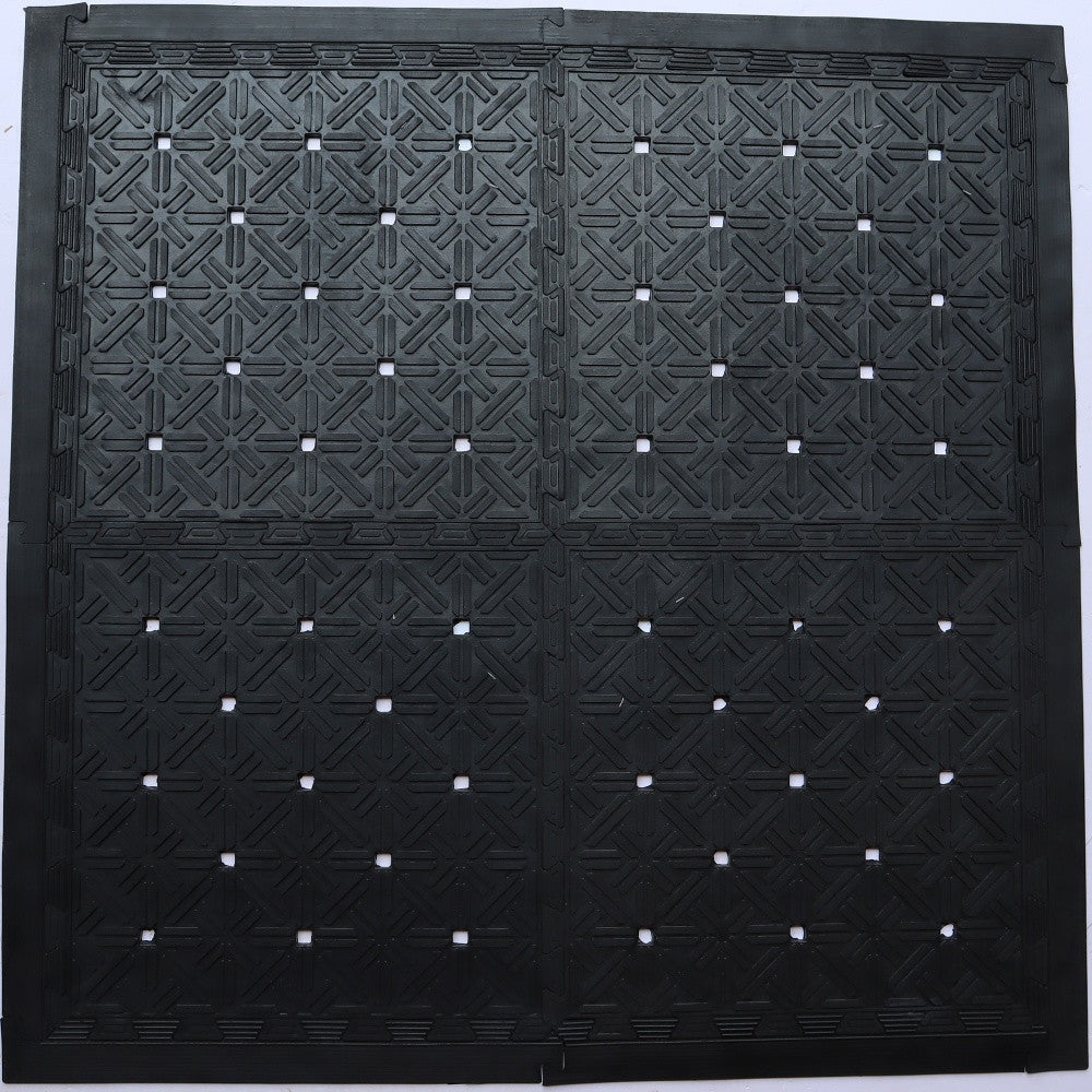 - Modern large 36-inch square mat is created with interlocking 18-inch rubber tiles.