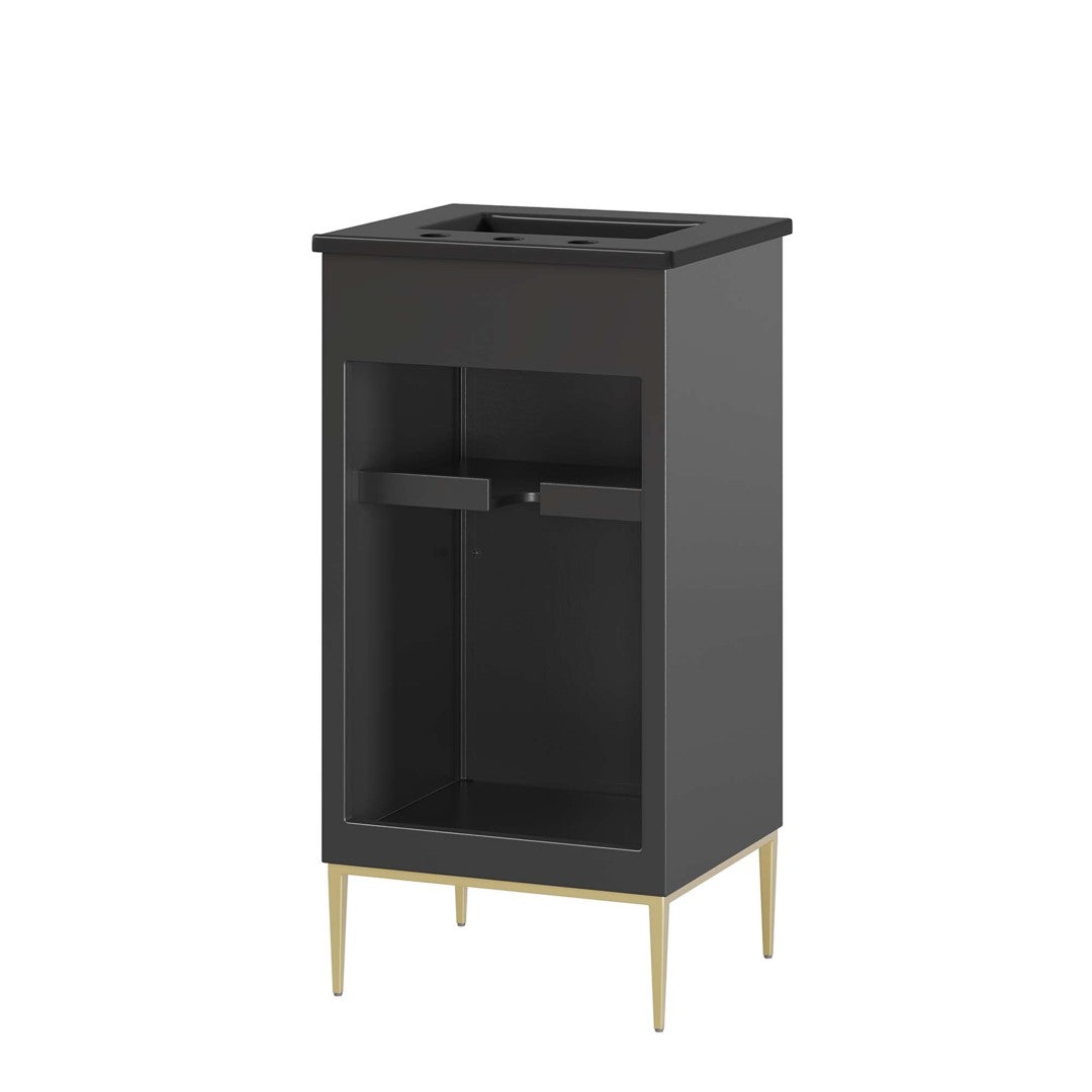 Bring modern glamour and practical storage to small bathrooms with the Awaken 18" Bathroom Vanity. Meticulous radial lines and a refined gold base create a striking focal point, while a ceramic sink with integrated countertop and thoughtfully concealed shelving keep daily essentials organized. Designed with durable solid wood and MDF construction, non-marking foot pads, and sleek gold hardware, this compact vanity combines style and function for powder rooms, guest baths, or tight spaces.