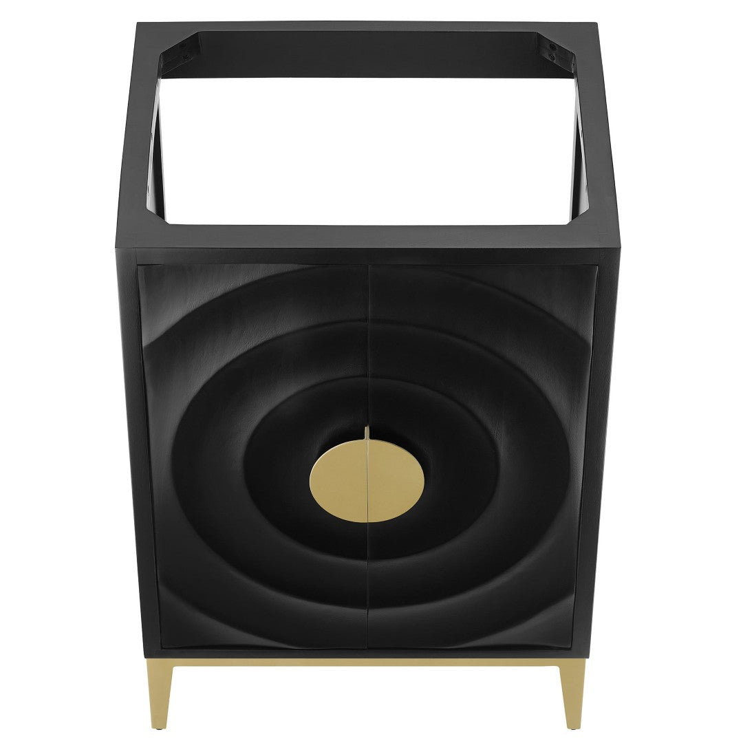 - 24" Bathroom Vanity (Sink Not Included) Concentric Circle Design Round Brass-like Metal Pulls Tapered Metal Legs Adjustable Shelf Plumbing Cut-Out Assembly Required