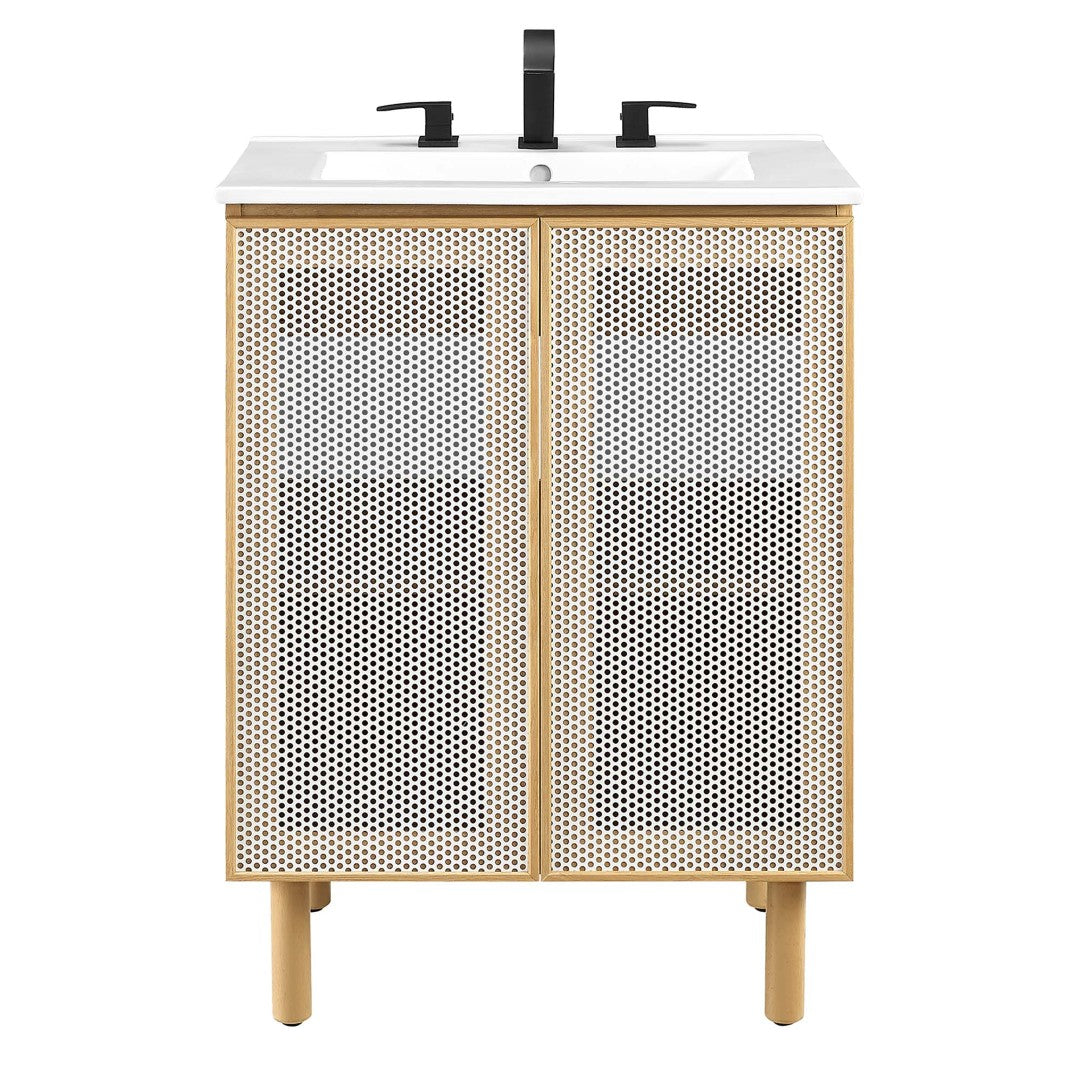Bring modern, functional style to compact bathrooms with the Calla 24" perforated metal vanity. Its clean lines, matte laminate finish, and airy metal door fronts create a contemporary focal point while concealing thoughtfully organized storage and a durable ceramic sink. Designed for easy installation and everyday use, this vanity balances minimalist aesthetics with practical details like adjustable shelving, push-to-open doors, and floor-protecting levelers.