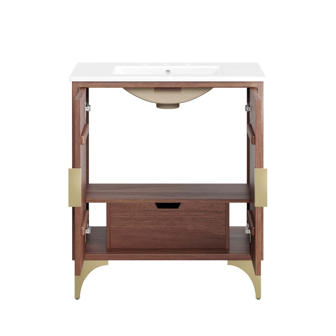 Refresh your bathroom with the Daylight 30" Vanity — a warm, sculptural centerpiece that blends solid craftsmanship with modern detailing. Hand-finished mango wood and brass-accented sun ray hardware create a refined focal point, while the integrated ceramic basin and thoughtful storage keep daily routines organized and elegant.