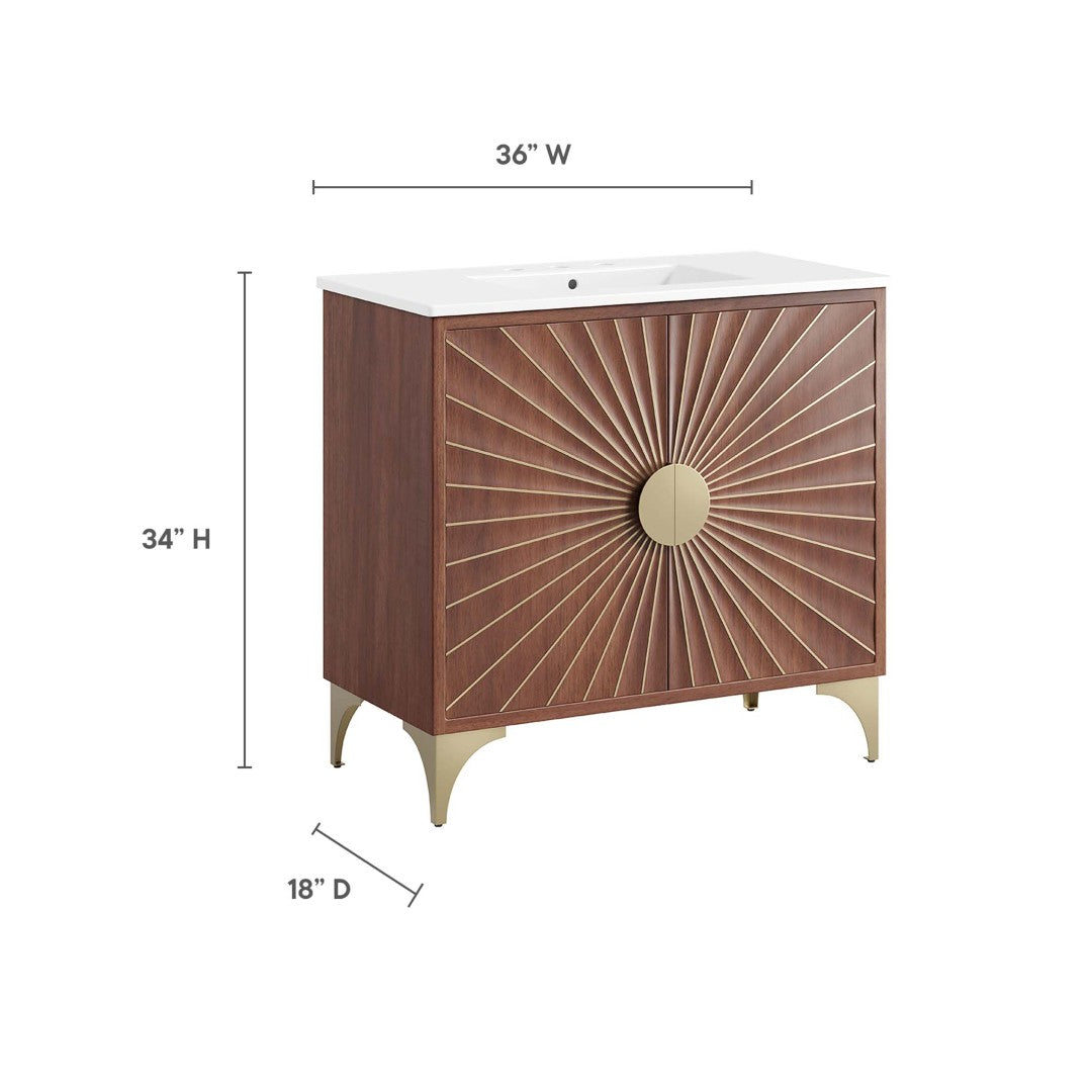 Bring a fresh, sunlit look to your bathroom with the Daylight 36" vanity — a crafted blend of warm mango wood, brass accents, and practical storage. The integrated ceramic basin and countertop create a cohesive, upscale profile while the open shelf and pull-out drawer keep daily essentials organized. Elegant arched brass legs and powder-coated sunray detailing add visual interest without sacrificing durability.