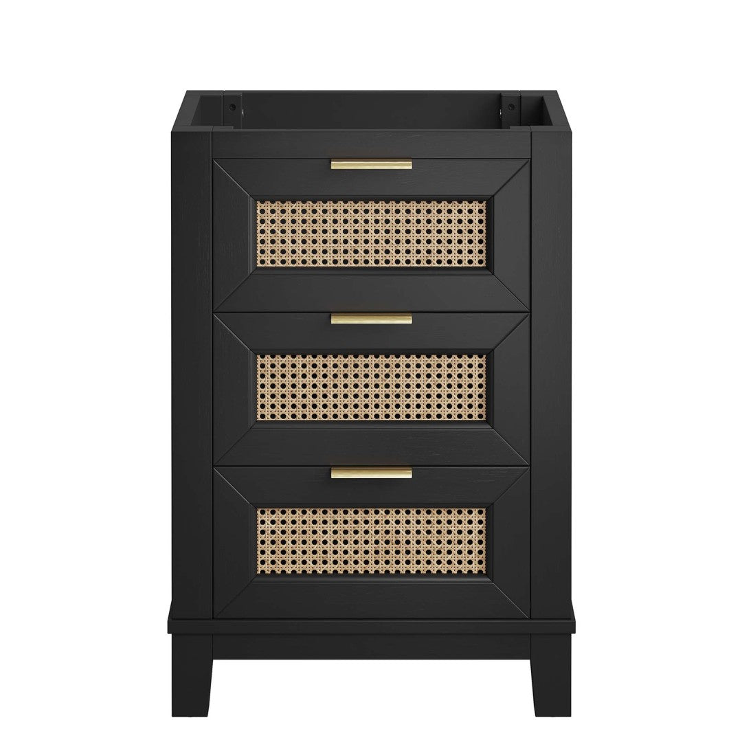 Elevate your bathroom with the Dixie 24" Solid Mahogany Vanity Cabinet — a blend of modern lines and warm, natural texture that brings both style and practical storage to compact spaces. Thoughtfully designed with rattan-front drawers and satin brass hardware, this vanity balances contemporary edge with timeless craftsmanship, making it a standout piece whether used with a vessel or drop-in sink (sink and fixtures not included).