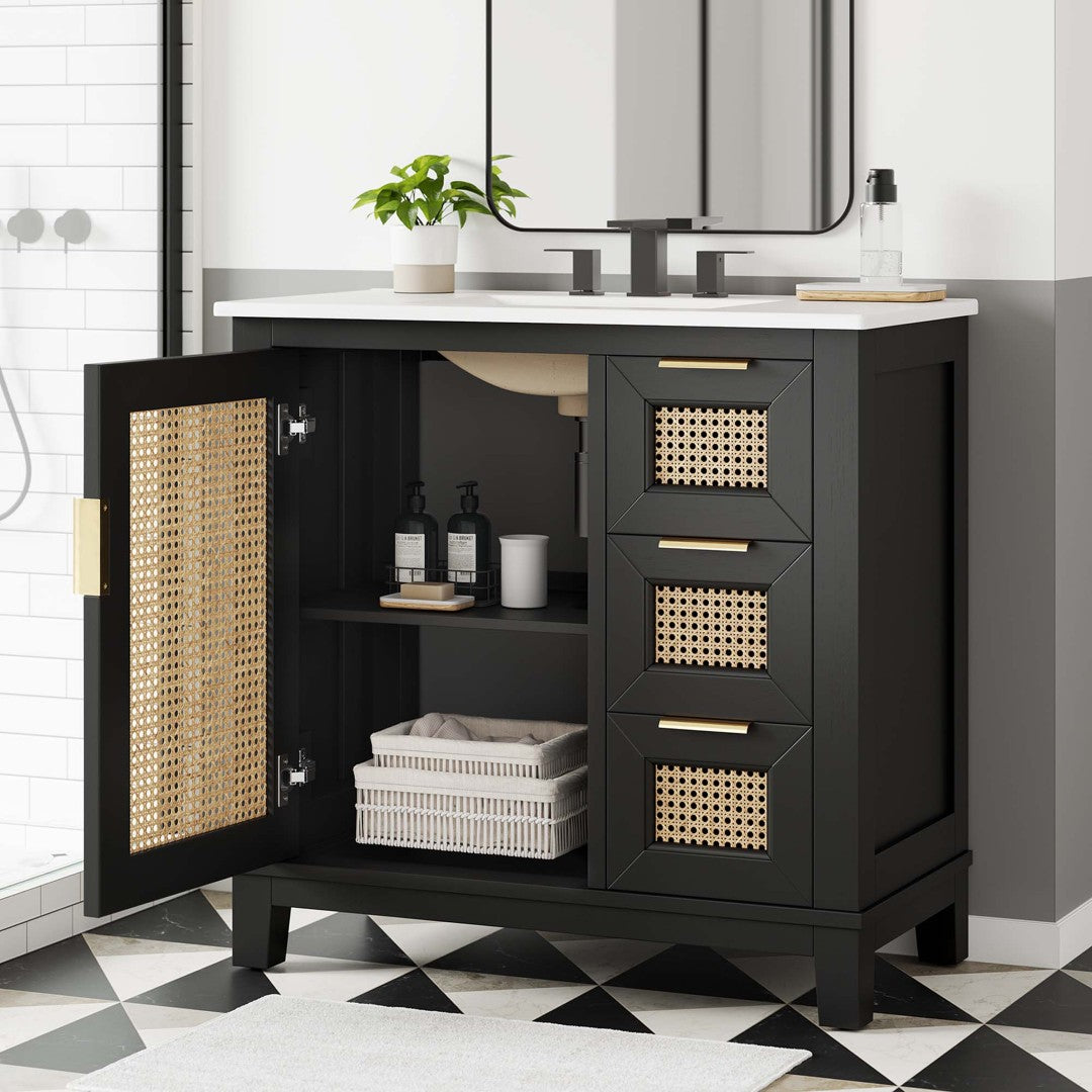 - Solid Mahogany Wood Ceramic Sink Basin Open Weave Rattan Detail Satin Brass Handles Soft-close Hinges Fixtures Not Included Assembly Required