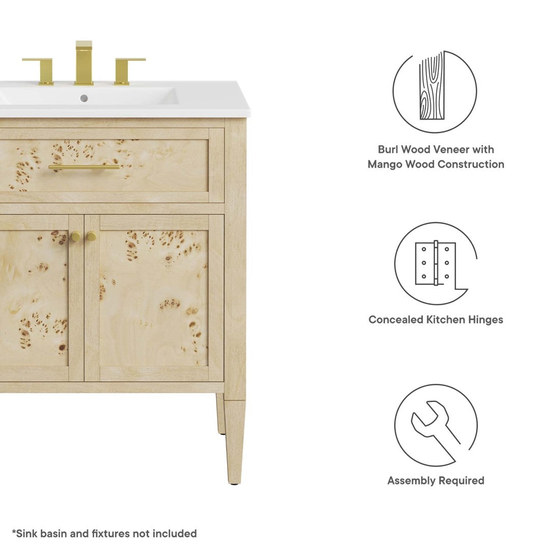 Elevate your bathroom with the Elysian 30" Burl Wood Vanity Cabinet — a beautifully crafted piece that blends warm, organic materials with functional design. Its mango wood construction and burl wood veneer create a unique, natural grain pattern that serves as a focal point, while thoughtful storage and a streamlined silhouette keep the space tidy and refined. This vanity is designed for easy integration with your preferred sink basin and fixtures (sold separately).