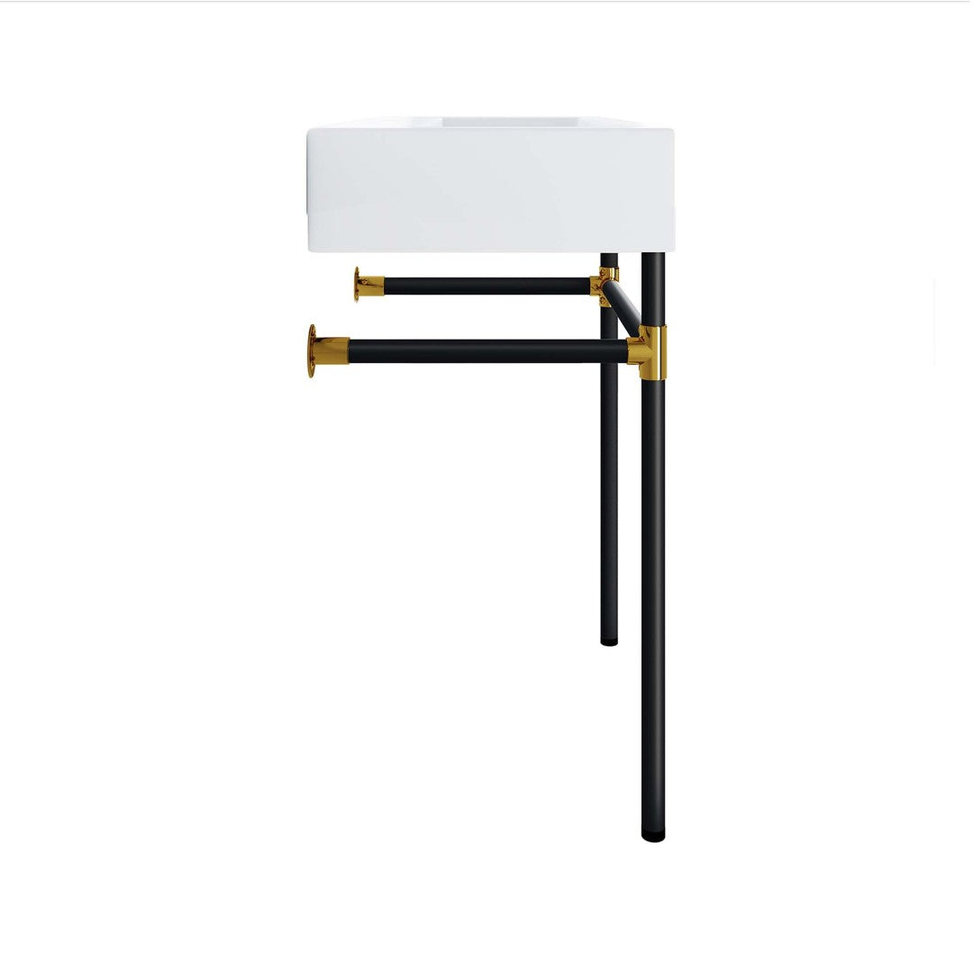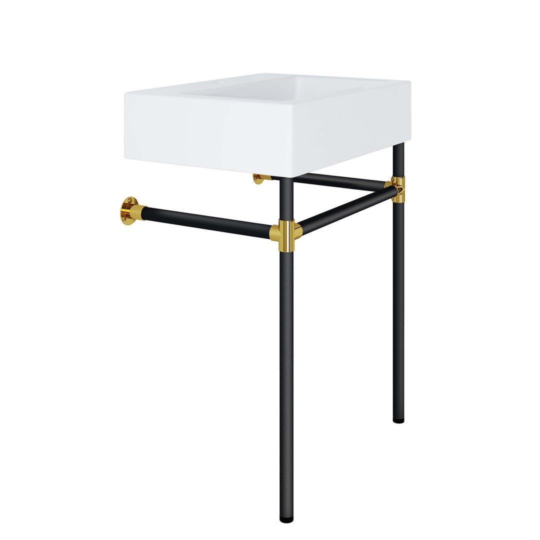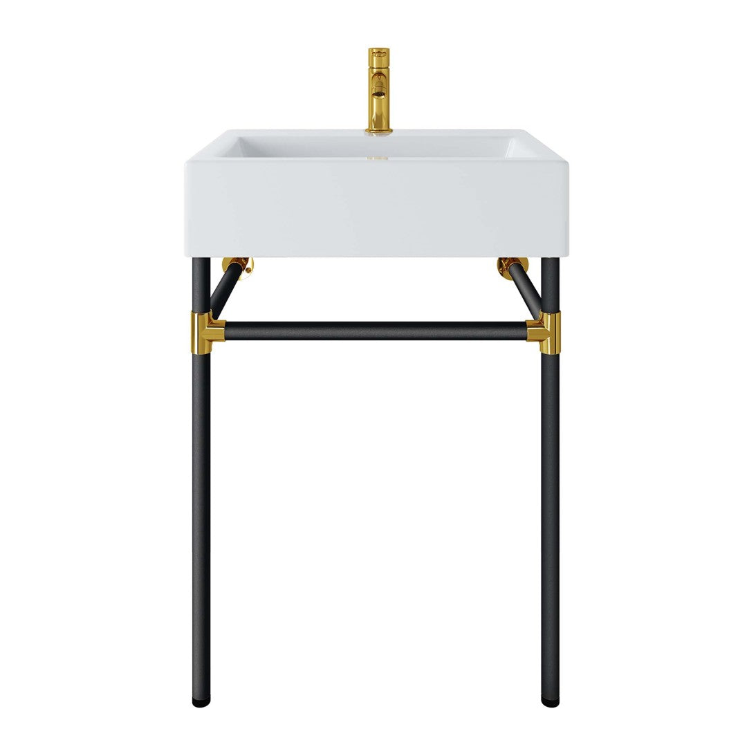 Transform your bathroom into a modern sanctuary with this sleek wall-mount vanity that blends minimalist design and durable construction. The glossy white ceramic basin, paired with a black stainless steel frame and gold-accented joints, creates a refined focal point while maximizing floor space — ideal for small bathrooms, powder rooms, or contemporary interiors. Easy to install and maintain, the vanity includes non-marking foot caps to protect flooring; faucet and other fixtures are not included.