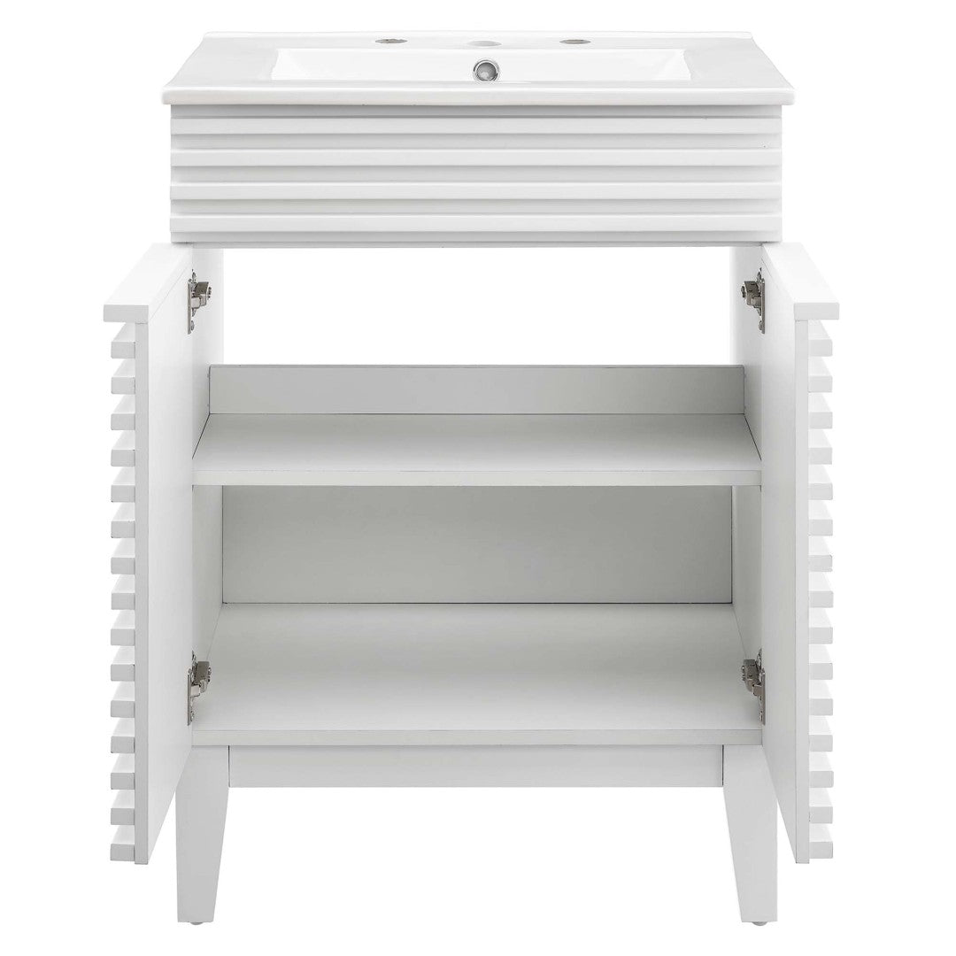 Bring mid-century modern flair and practical functionality to your bathroom with this compact, stylish vanity. Clean lines, a curved integrated basin, and tapered wood legs create an elegant focal point while the soft-close doors and adjustable interior shelf provide quiet, convenient storage for daily essentials.