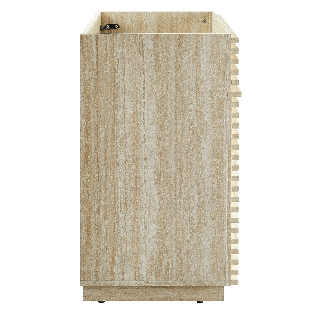 Bring mid-century modern warmth and practical storage to your bathroom with this compact, faux travertine vanity cabinet. Its slatted cabinet face, plinth base and soft-close doors deliver a refined, functional look while leaving you free to customize the top with the sink and fixtures of your choice.