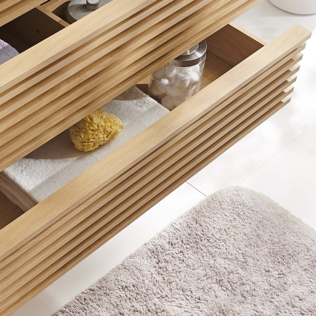 Give your bathroom a clean mid-century modern update with the Render wall-mount vanity. Designed for style and everyday functionality, this 36" vanity combines a walnut-grain laminate finish with sturdy MDF and particleboard construction, smooth full-extension drawers for organized storage, and a space-saving floating profile that makes cleaning easy and visually expands smaller bathrooms. The drywall-friendly mounting cleat simplifies installation (fixtures and sink basin not included), while crisp lines and practical proportions deliver a timeless, versatile piece.