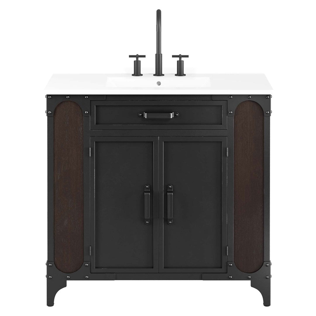 Bring industrial modern flair and practical storage to your bathroom with a durable, well-appointed vanity designed for everyday use. The Steamforge 36" vanity pairs a metal frame with antique patina and MDF wood-grain veneer for an authentic, utilitarian look, while an integrated ceramic sink and thoughtful interior layout keep toiletries organized and accessible.