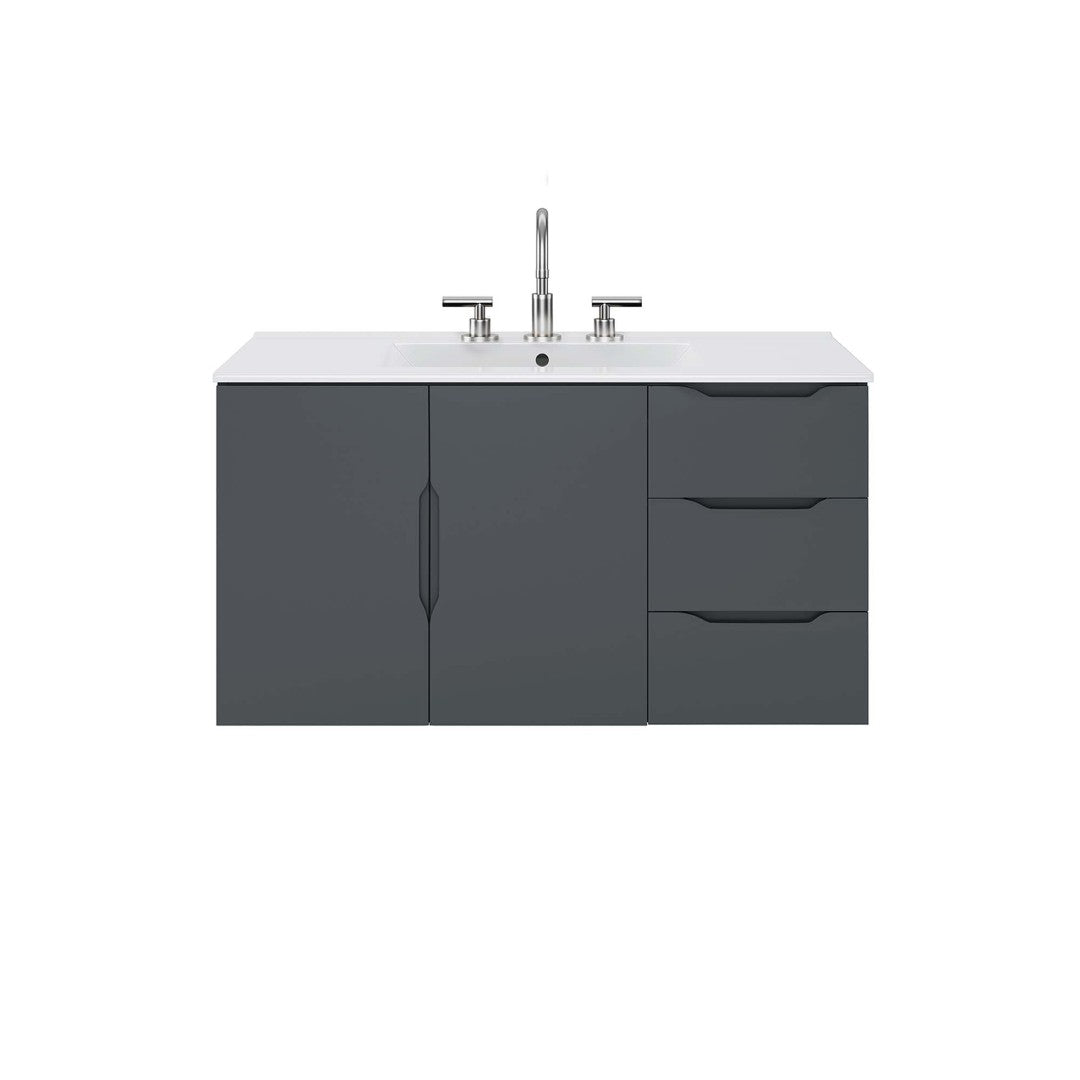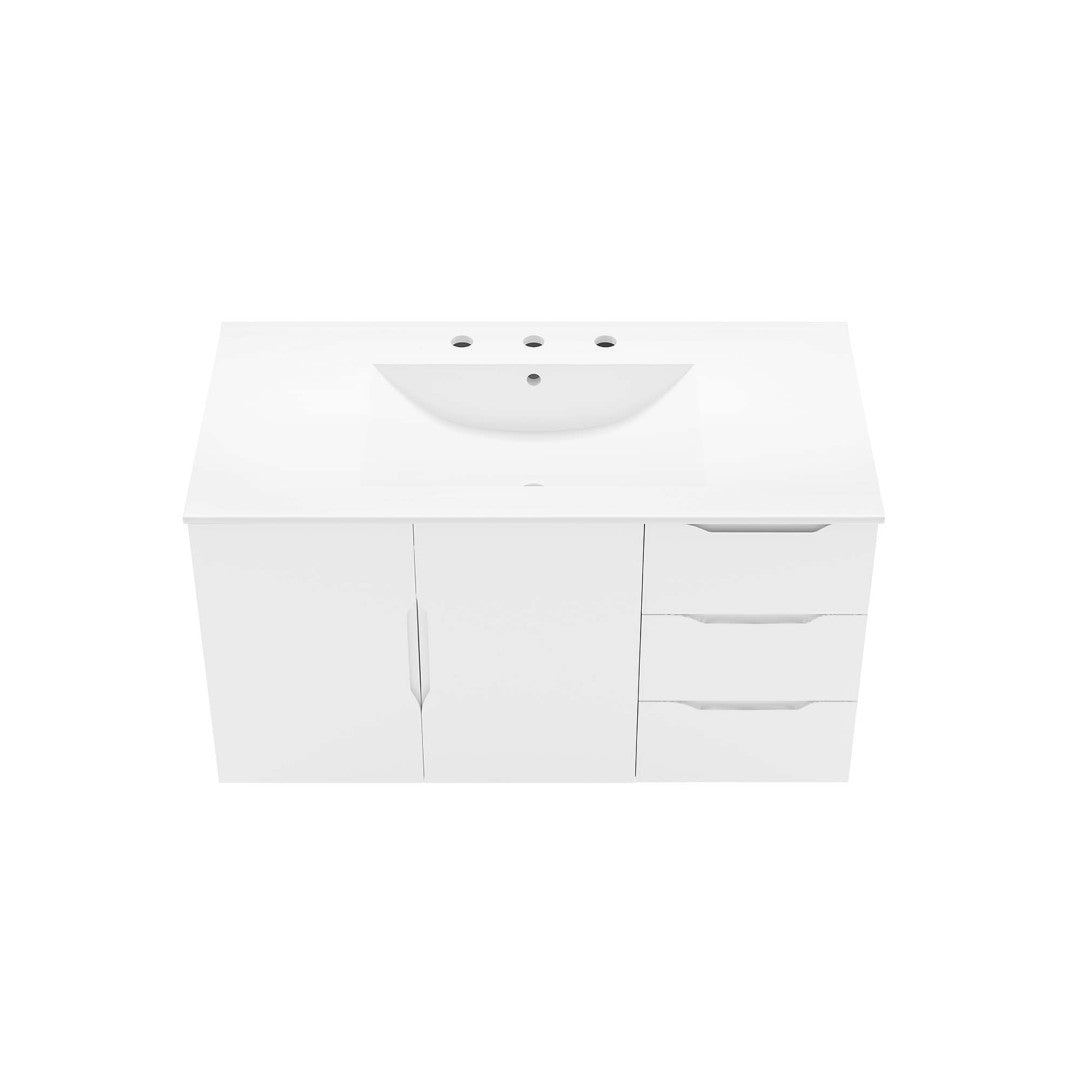 - Modern Bathroom Vanity Soft-Close Doors MDF and Particleboard Construction Wall-Mount Design Ceramic Sink With Integrated Countertop 8" Centerset Faucet Holes Assembly Required