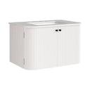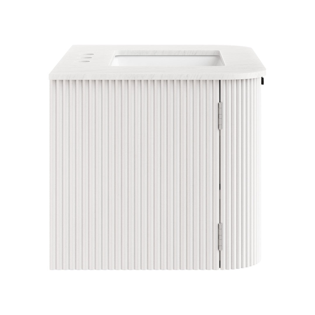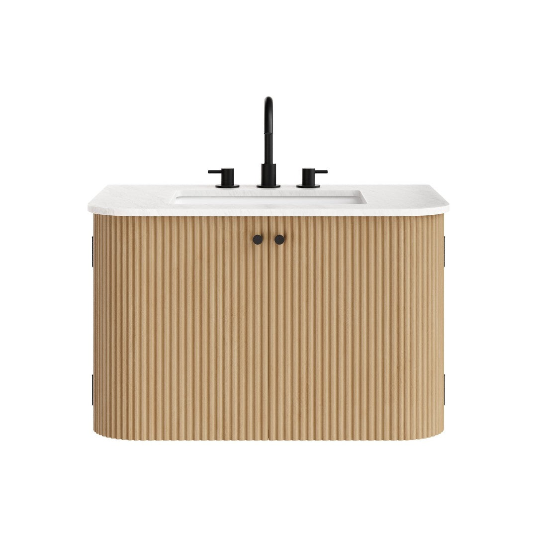 Give your bathroom a modern, airy upgrade with this sleek wall-mounted vanity featuring a real marble sink and a textured fluted wood base. Its floating design frees floor space and visually enlarges the room, while the curved marble basin and three-hole 8" widespread layout let you choose a faucet style that complements your décor. Thoughtful storage, soft-close doors, and plumbing cutouts make installation and daily use convenient—ideal for contemporary bathrooms that value both form and function.