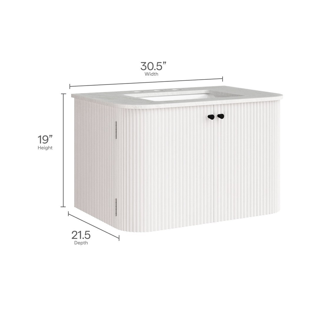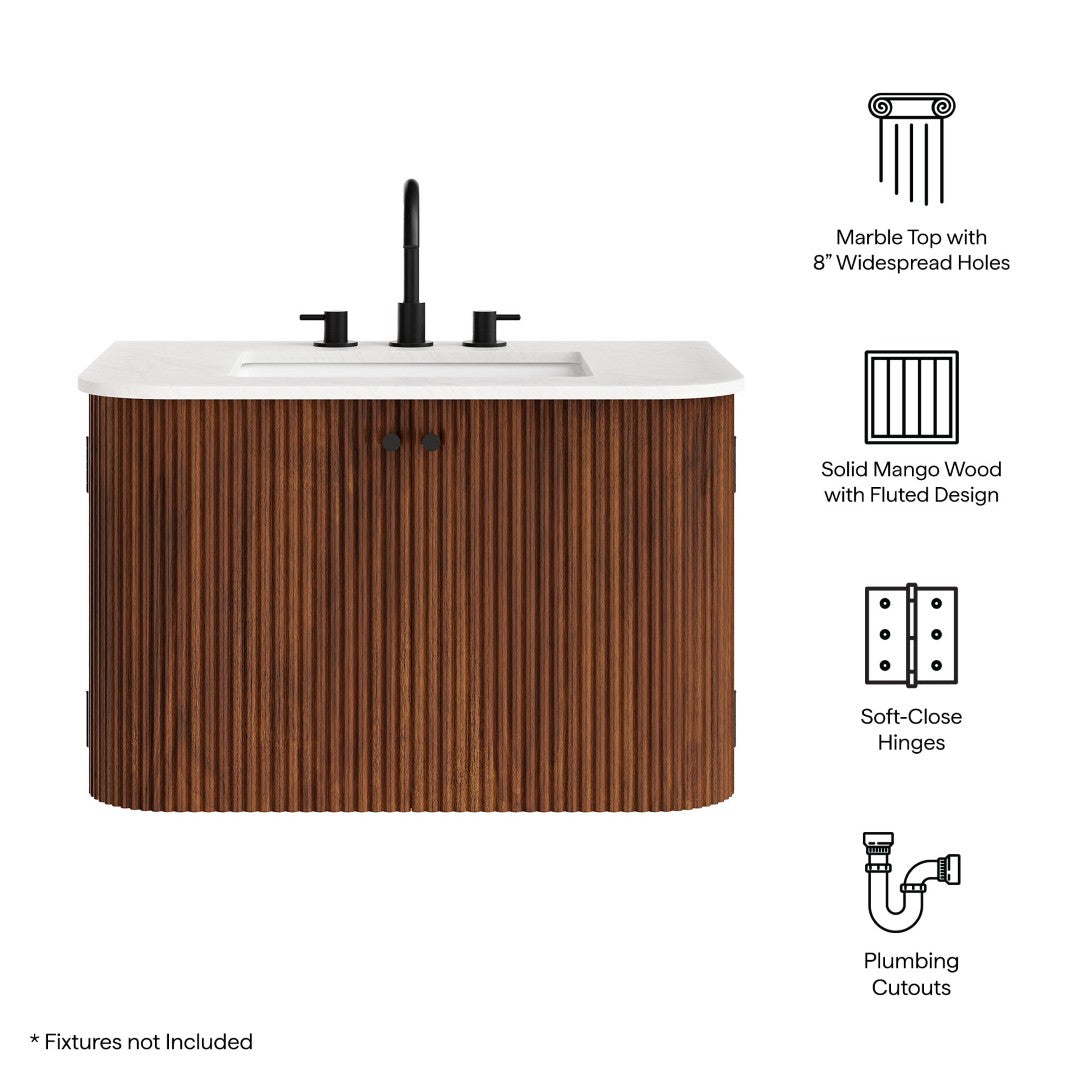 - 30" Wall Mounted Vanity Solid Mango Wood Base with Fluted Pattern Marble Sink 8" Widespread Faucet Holes Soft-Close Hinges Plumbing Cutouts Fixtures Not Included