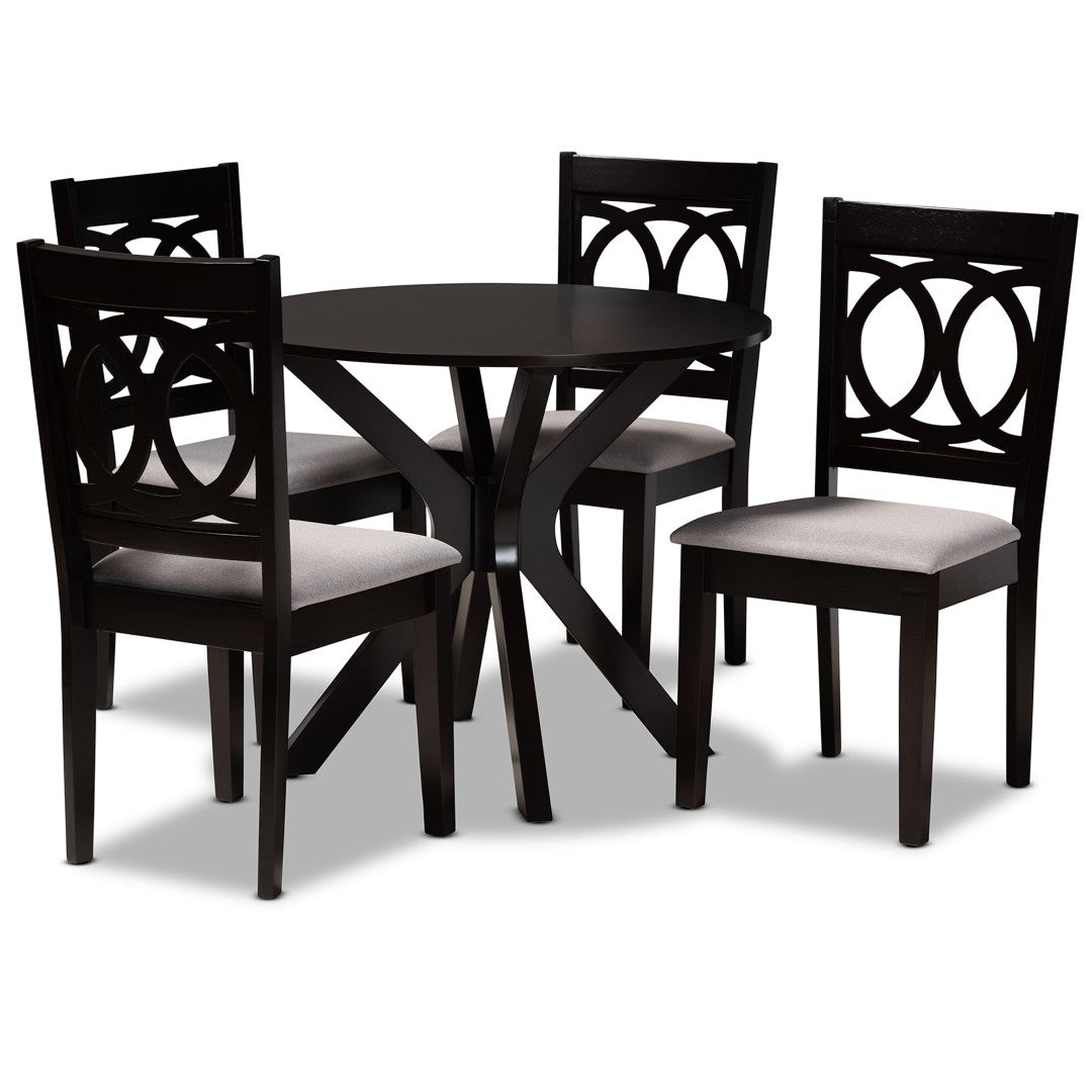 Bring contemporary style and everyday comfort to your dining area with the Sanne 5-piece set. Designed with clean lines, a warm dark-brown wood finish, and plush grey fabric seats, this compact round table and four-chair ensemble balances modern aesthetics with practical durability—ideal for apartments, breakfast nooks, or intimate dining rooms.