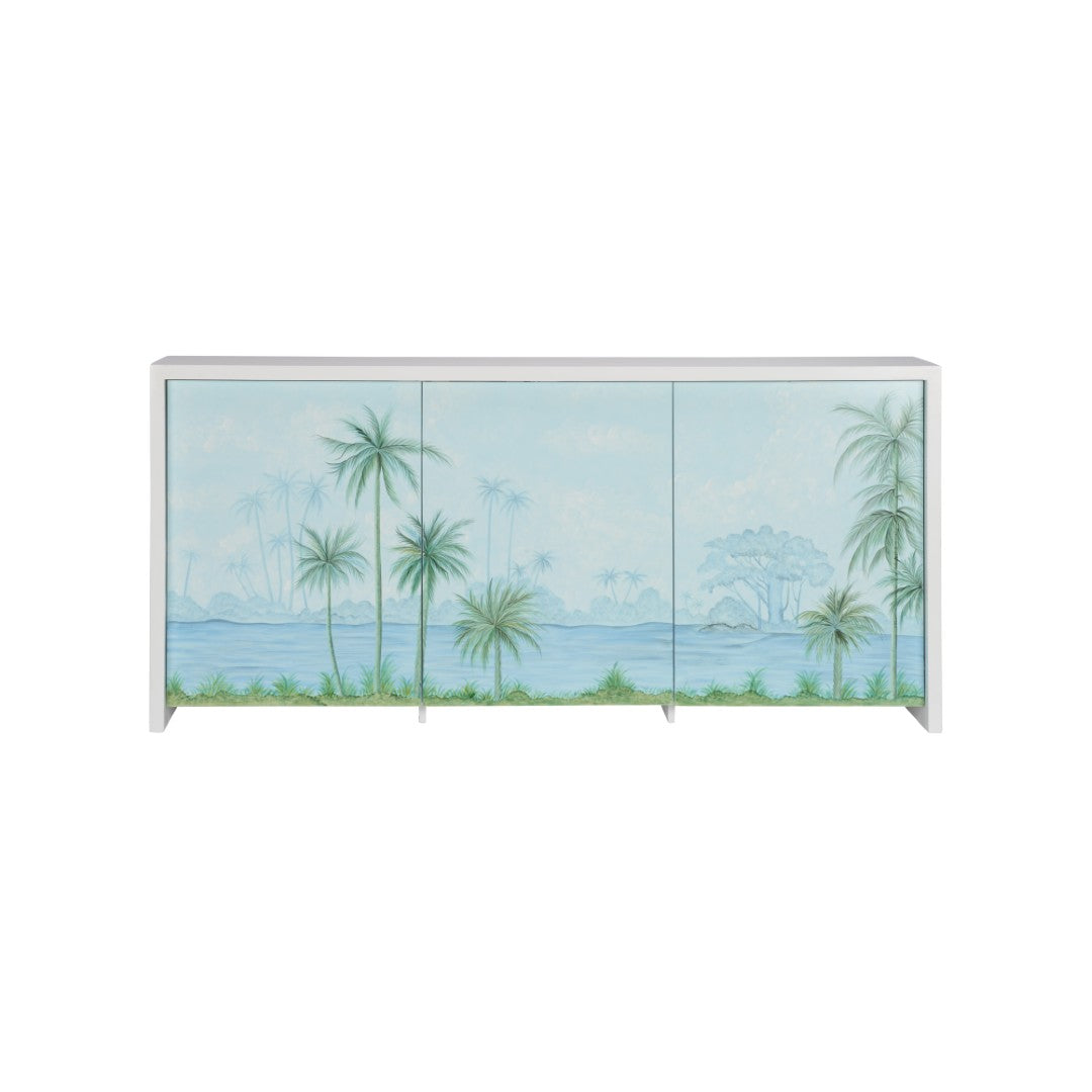 Bring a breezy, tropical vibe into your living space with this hand-painted console. Featuring a detailed island scene of serene waters and graceful palm trees, the piece combines artistic flair with functional storage to serve as both a focal point and a practical addition to entryways, living rooms, or dining areas.