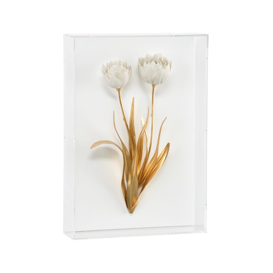 Add a delicate, artful accent to any room with this handcrafted porcelain flower wall piece. Handmade matte white porcelain blooms and antique gold leafed iron leaves create a refined contrast against a soft white linen background, all presented in a low-profile acrylic shadow box frame. Designed by Bill Cain, this piece works beautifully as a standalone focal point or grouped with other pieces from the four-item series.
