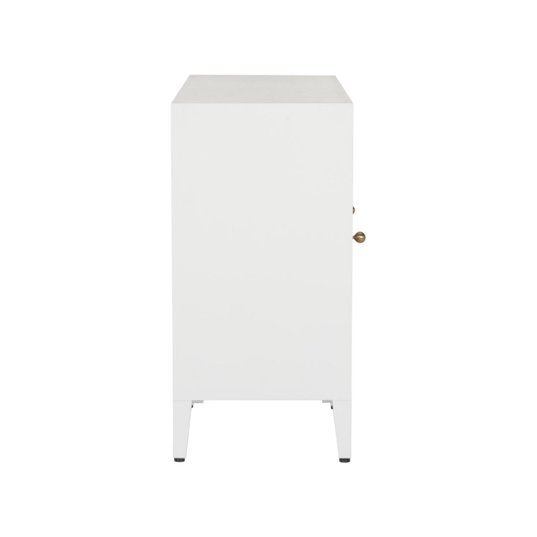 - Aged brass hardware provides a warm, vintage contrast to the contemporary white