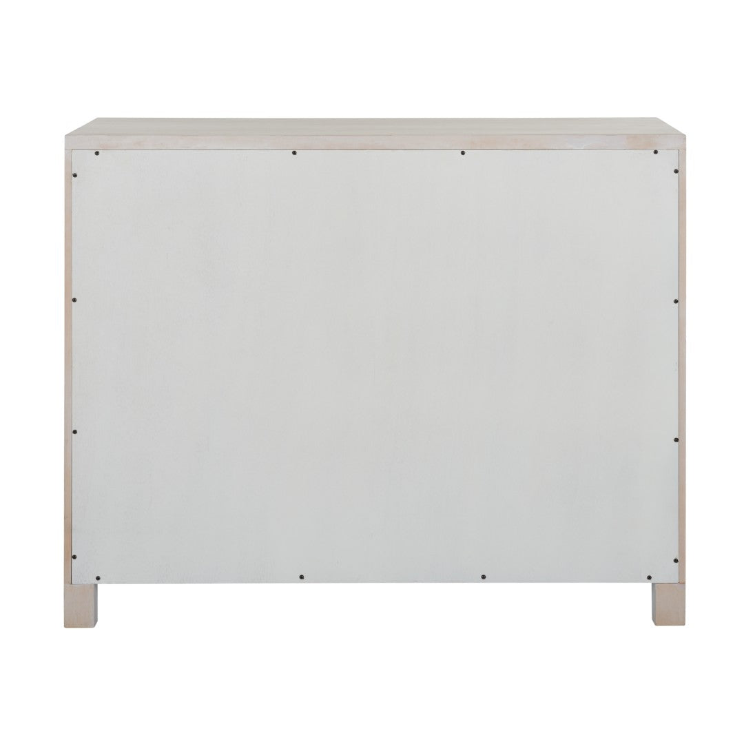 - Whitewashed finish that accentuates natural wood grain and offers a light, airy aesthetic