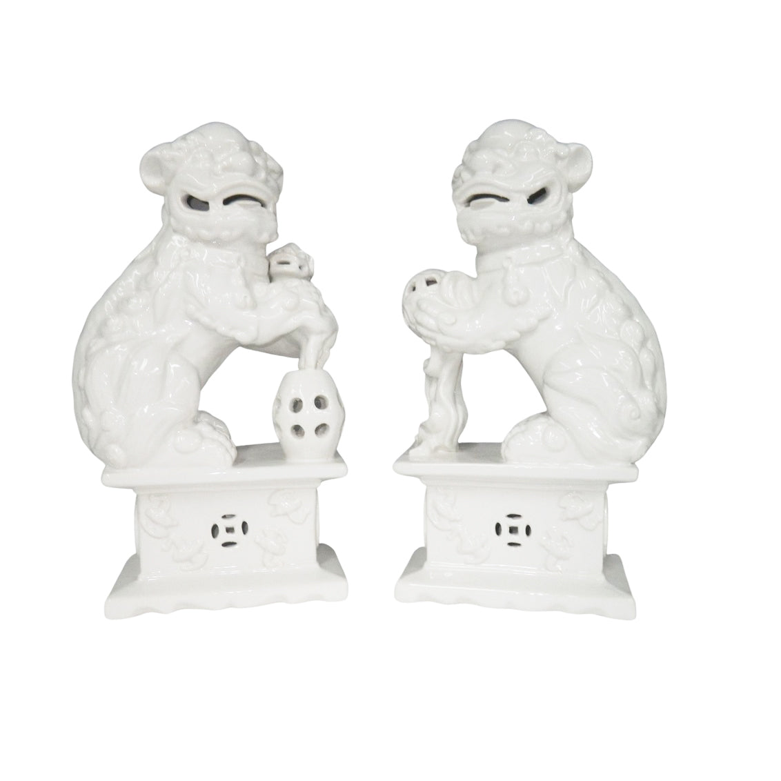 Add an elegant, timeless accent to your décor with this pair of porcelain White Foo Dogs. Finished in a smooth white glaze and designed by Bill Cain, these guardian figurines bring refined sculptural detail and a sense of balance to mantels, consoles, shelves, or entryway displays.