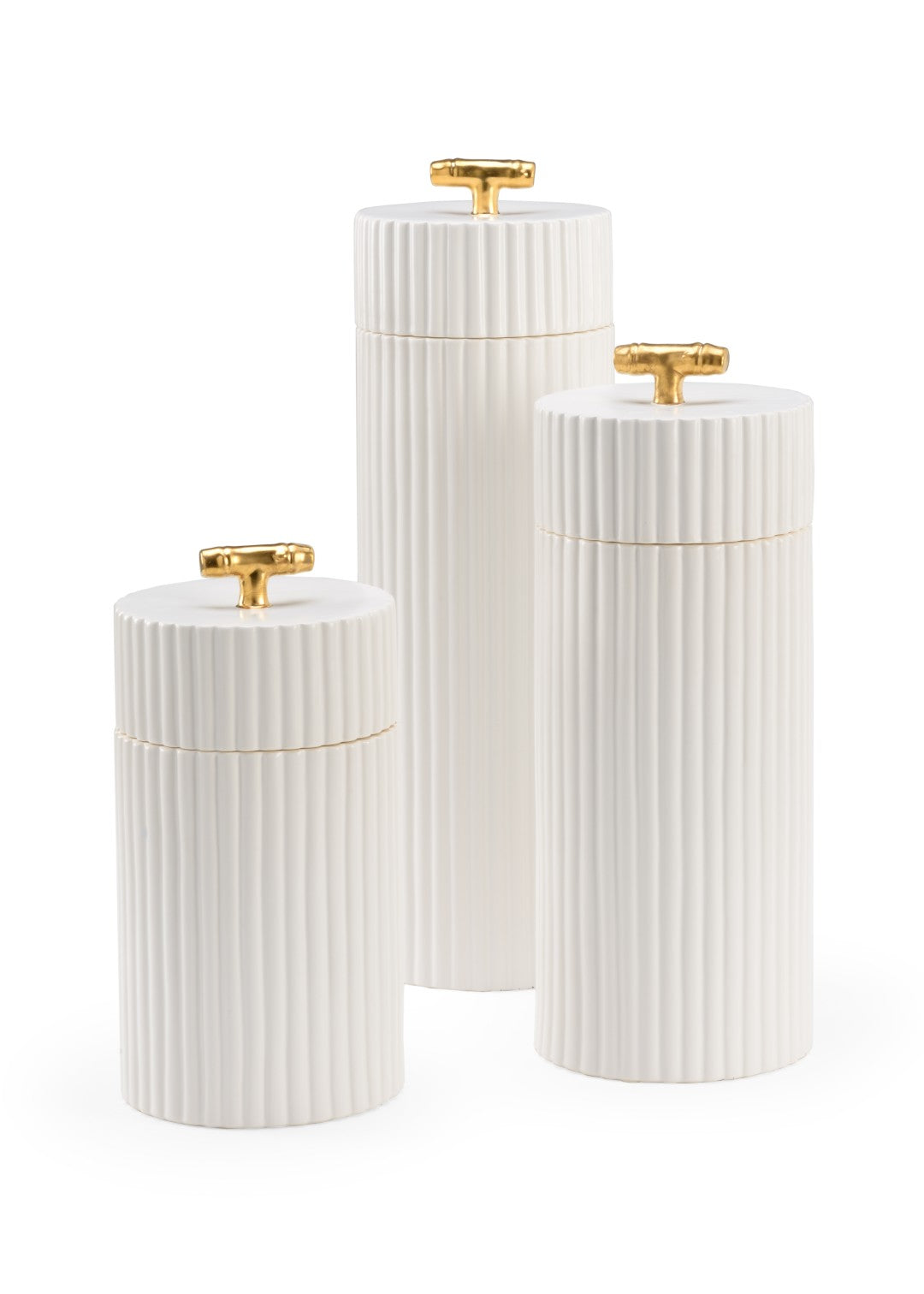 These elegant white ceramic canisters bring a refined, nature-inspired accent to kitchen counters, pantry shelves, or decorative displays. Each piece features a smooth white glaze and a metallic gold bamboo-style handle that blends classic ceramic craftsmanship with a touch of modern glamour. Designed by Claire Bell, the set creates a cohesive look whether used for storage or styling.