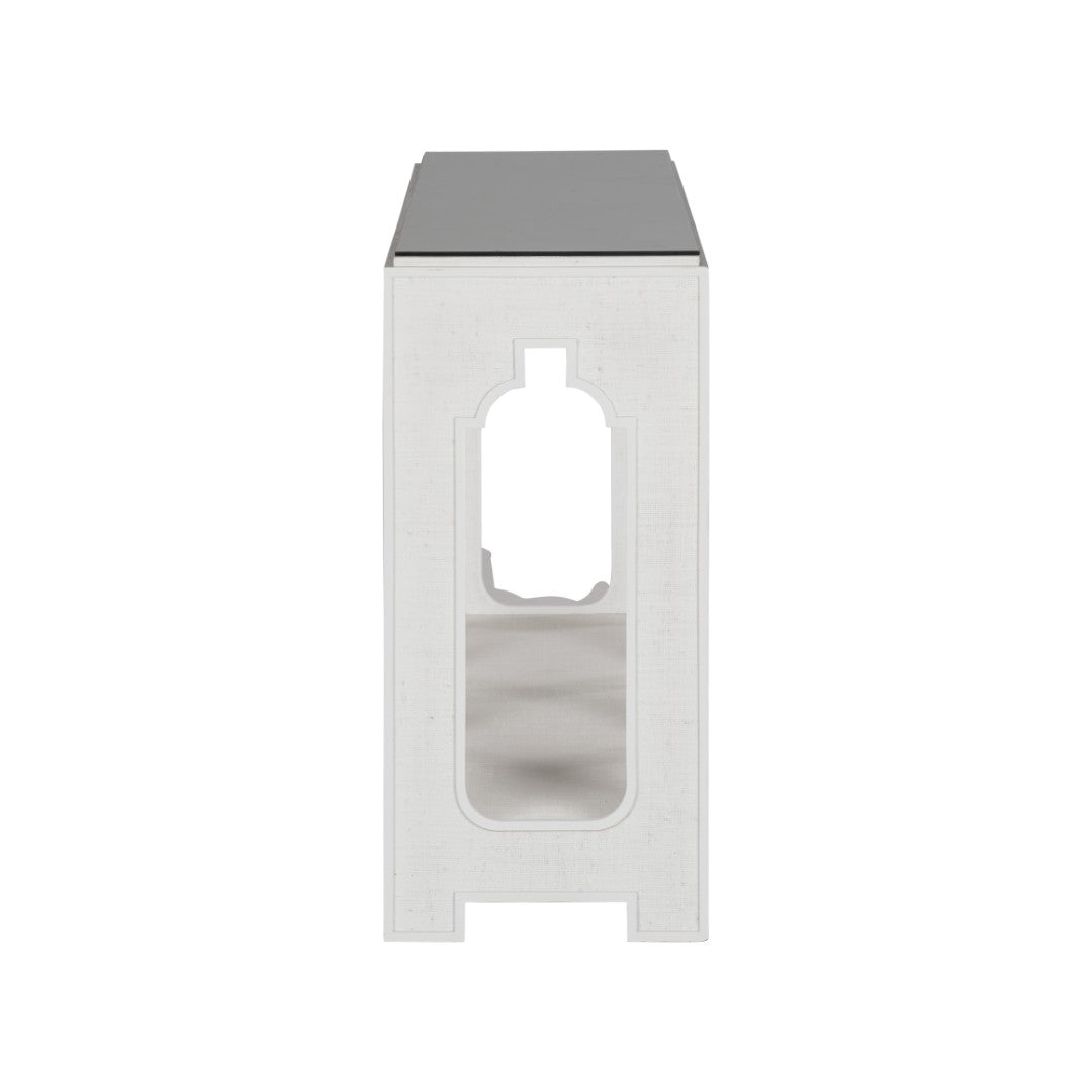 Bright and sculptural, this console brings refined texture and practical display space to entryways, living rooms, or hallways. Wrapped in crisp white raffia, it pairs artisanal surface detail with clean modern lines and a removable glass top for easy styling and maintenance — a versatile focal point designed by Jamie Merida.