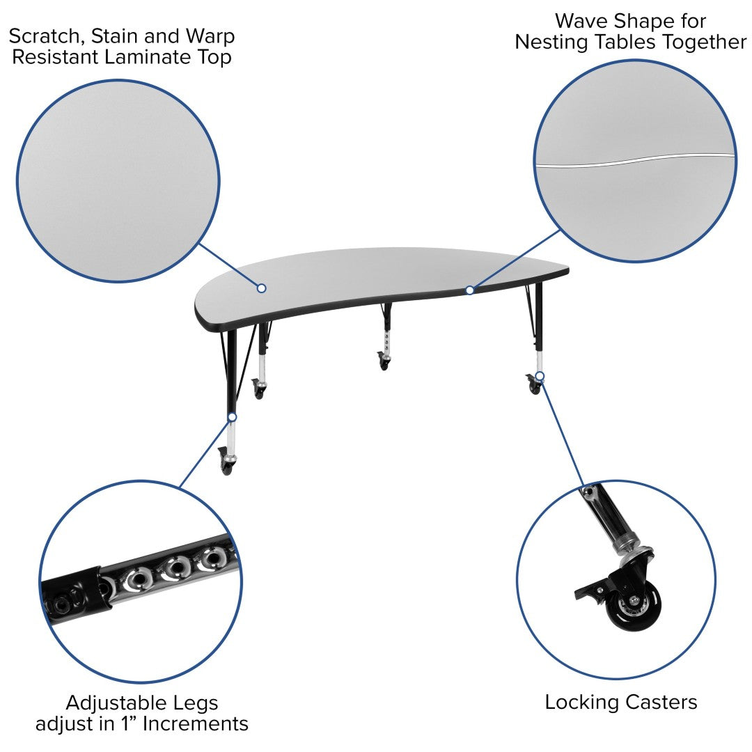 Create collaborative, flexible learning spaces with this versatile 2-piece nesting activity table set designed for early learners. The wave-shaped, half-circle design encourages group interaction and project-based work while the mobile, height-adjustable construction makes it easy to reconfigure your classroom, lab, library, or playroom on the fly. Durable, low-maintenance surfaces and secure locking casters ensure long-lasting performance through many classroom turnovers.