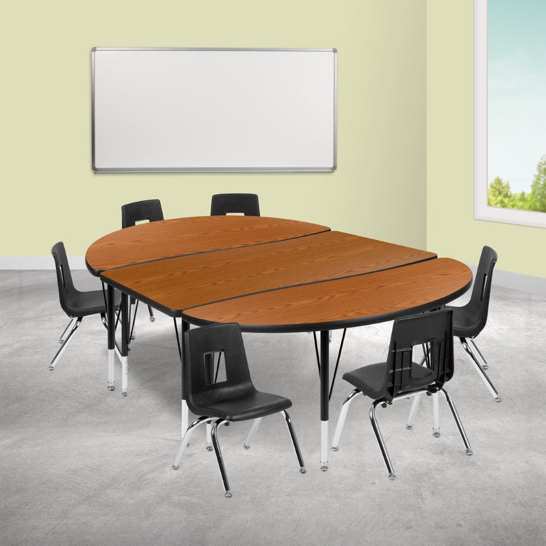 - Set configuration: 1 wave-shaped activity table + 8 ergonomic student stack chairs (9 pieces total).