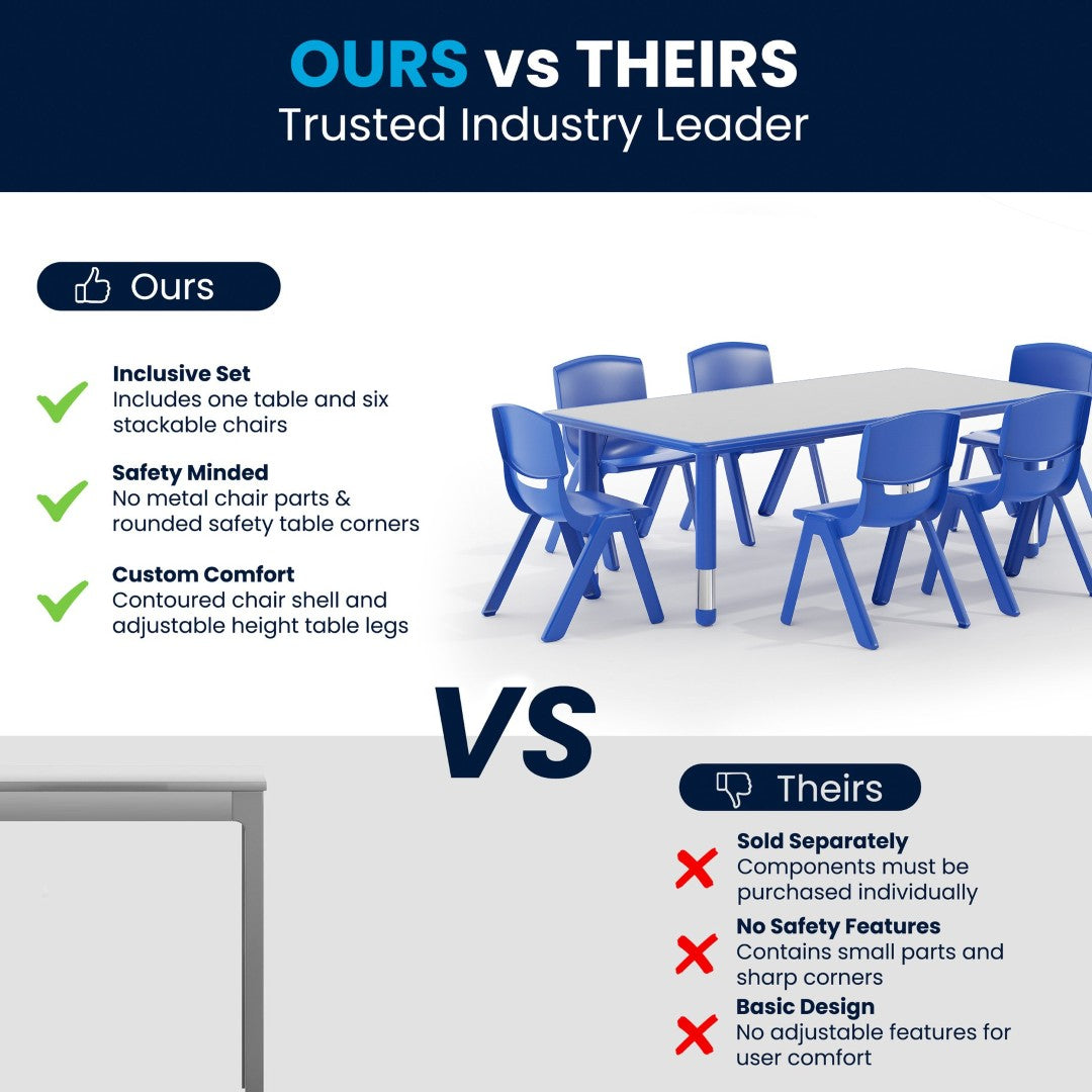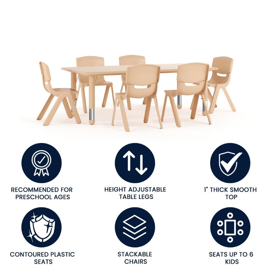 Engaging, durable, and thoughtfully designed for early learning environments, this adjustable activity table set creates a comfortable, safe space for group lessons, arts and crafts, snack time, and free play. The set includes a spacious rectangular table and six contoured chairs built to withstand daily use in classrooms, daycares, preschools, libraries, and playrooms — offering long-term versatility as children grow.