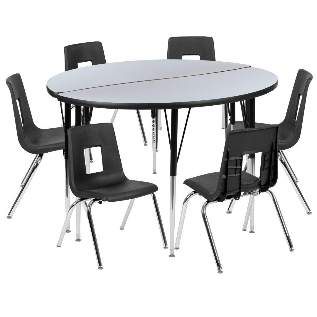 - Set Configuration: 8-piece flexible learning wave activity table set with student stack chairs (pre-built bundle).