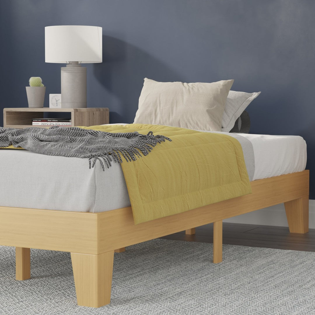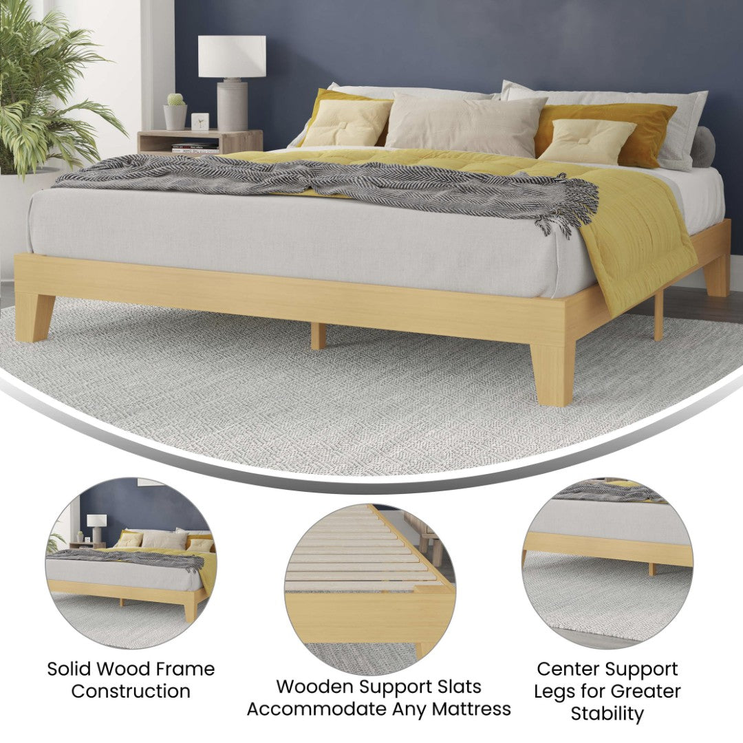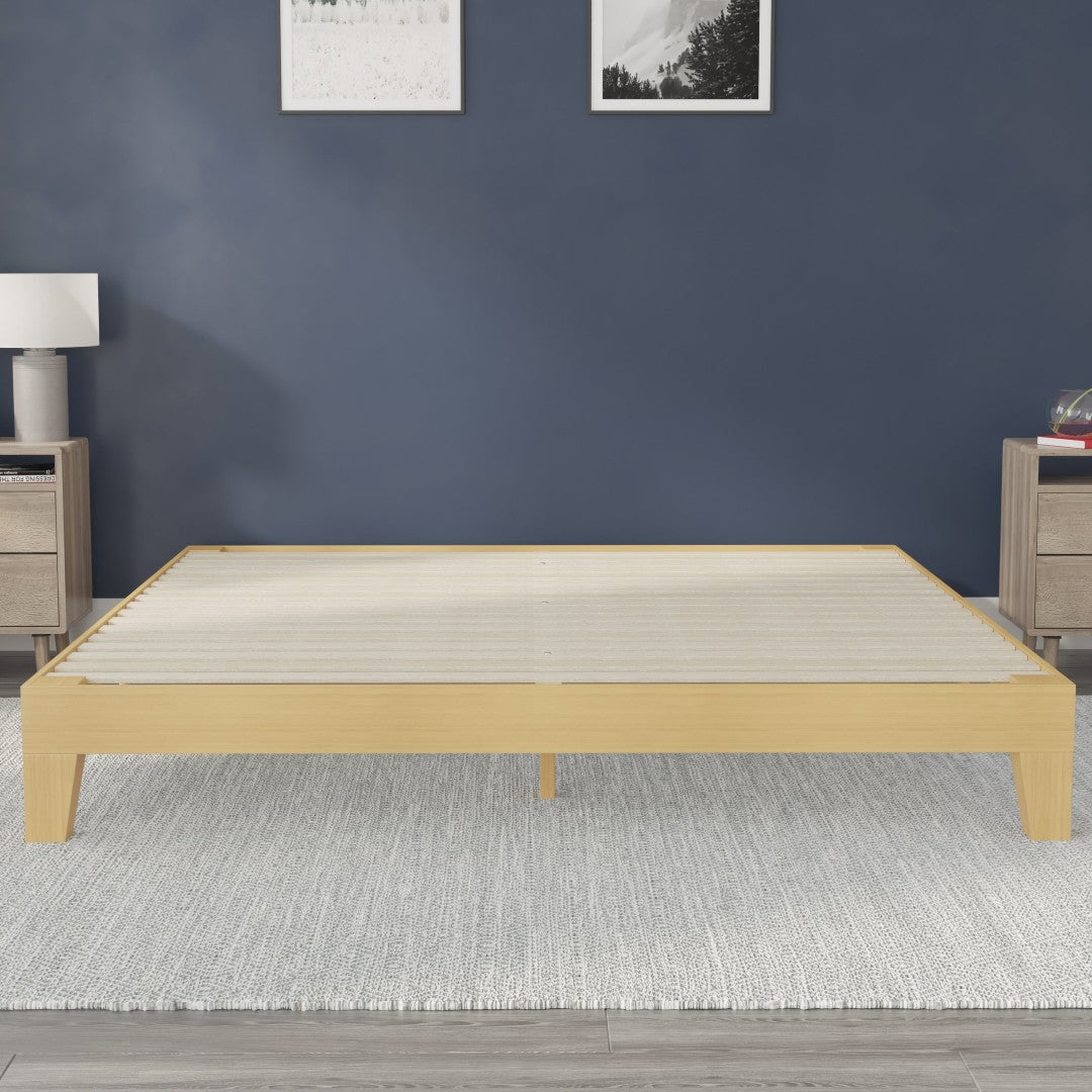 Bring mid-century modern warmth and reliable support to your bedroom with this sleek full platform bed. Its natural pine finish and low-profile silhouette create an airy, contemporary look while the sturdy wood construction and reinforced slats provide a dependable foundation for any mattress—no box spring required. Easy to assemble and thoughtfully designed to protect floors, this bed is ideal for everyday use or guest rooms.